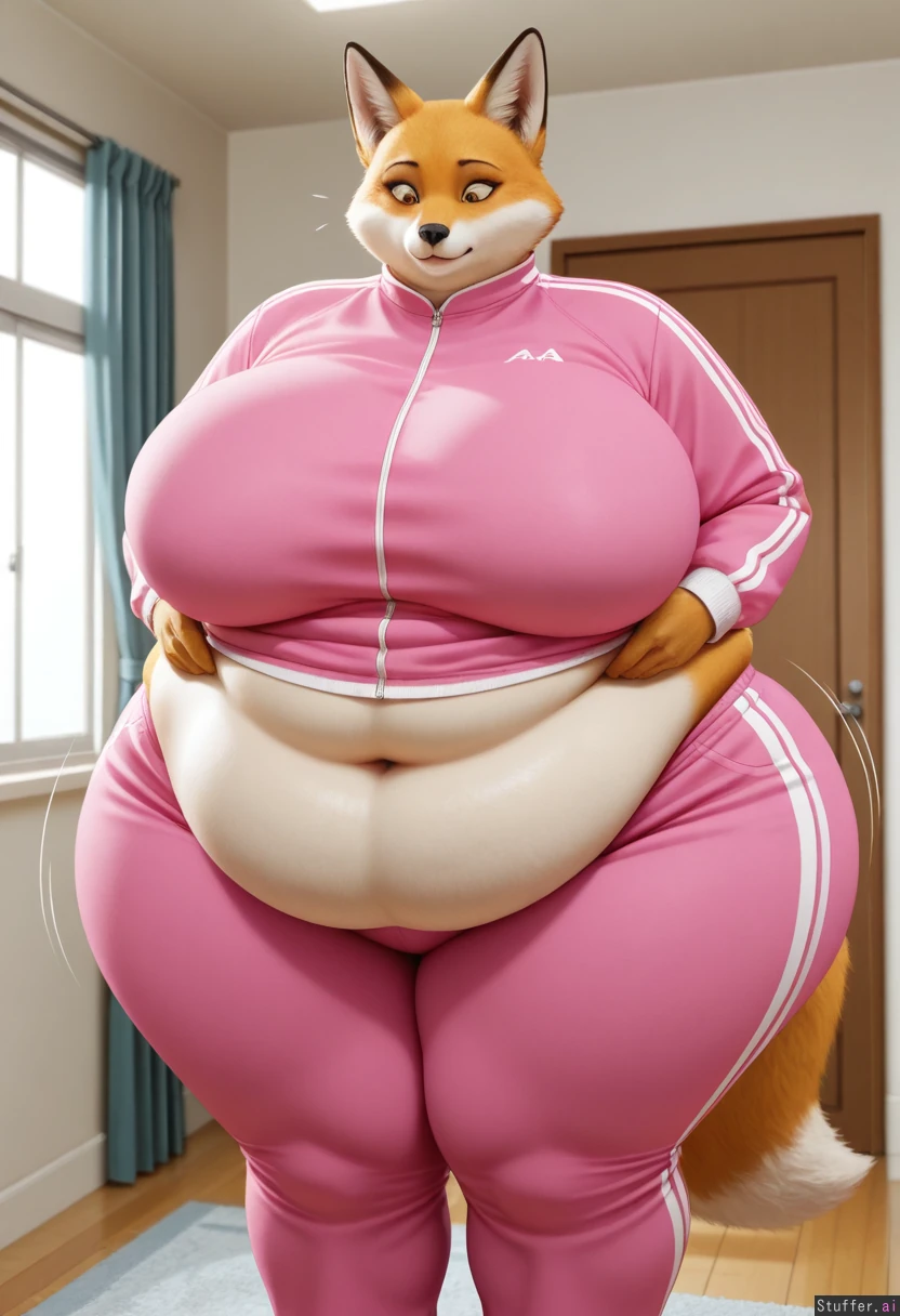 (photoRealistic), fox, furry, solo (Pink Tracksuit), (((fat, belly, thick thighs, wide hips, gigantic fat ass, thick breasts, weight again, (overweight)))), at home, front view, a surprised look