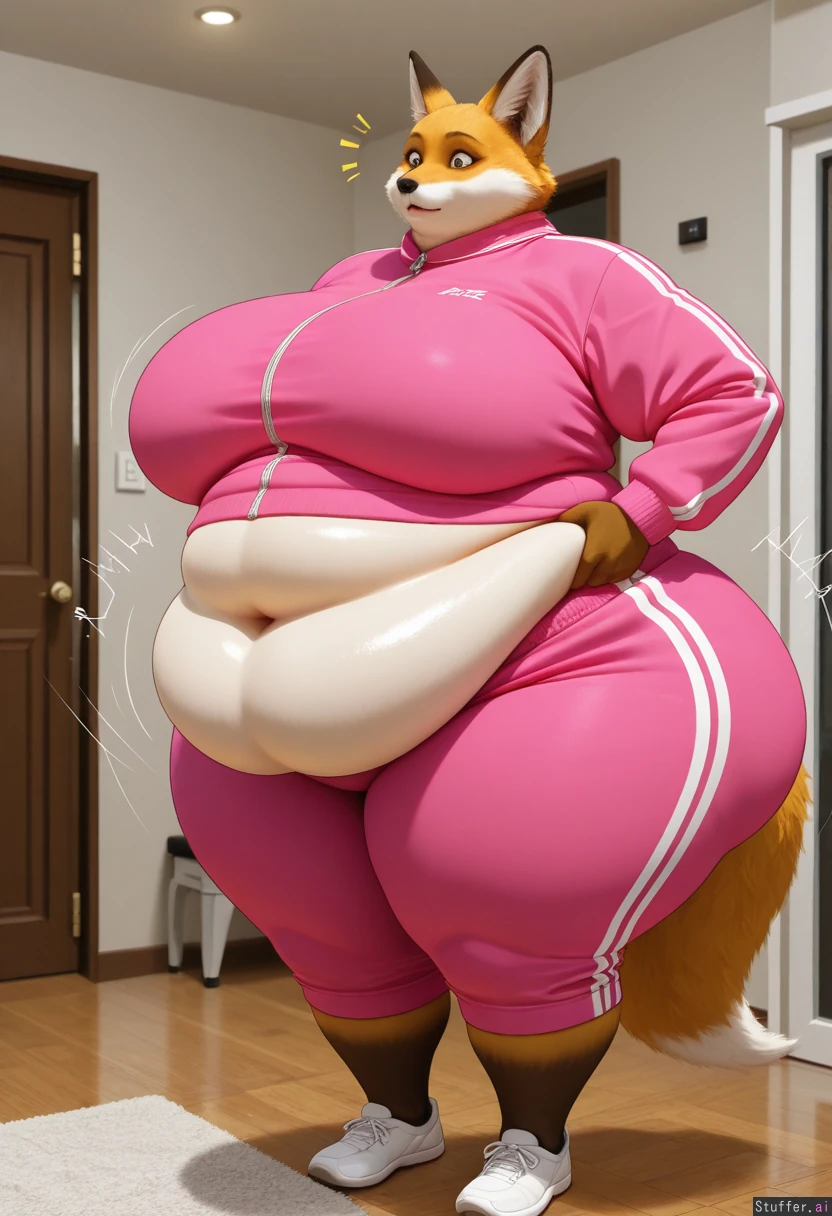 (photoRealistic), fox, furry, solo (Pink Tracksuit), (((fat, belly, thick thighs, wide hips, gigantic fat ass, thick breasts, weight again, (overweight)))), at home, front view, a surprised look