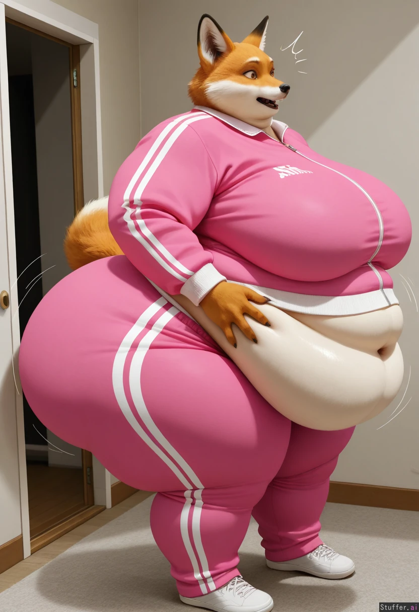 (photoRealistic), fox, furry, solo (Pink Tracksuit), (((fat, belly, thick thighs, wide hips, gigantic fat ass, thick breasts, weight again))), at home, front view, a surprised look