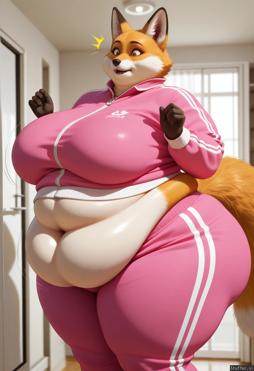 (photoRealistic), fox, furry, solo (Pink Tracksuit), (((fat, belly, thick thighs, wide hips, gigantic fat ass, thick breasts, weight again))), at home, front view, a surprised look