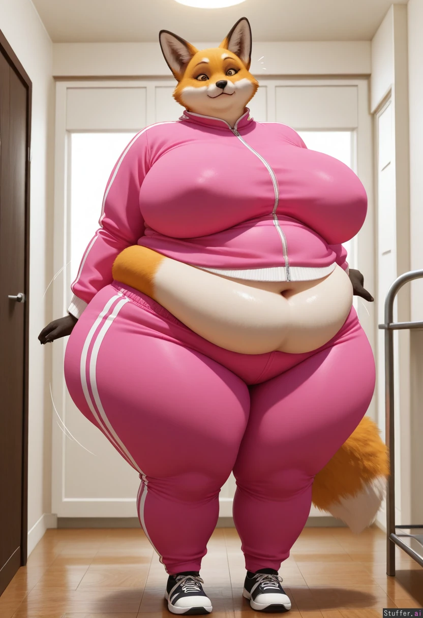 (photoRealistic), fox, furry, solo (Pink Tracksuit), (((fat, belly, thick thighs, wide hips, gigantic fat ass, thick breasts, weight again))), at home, front view, a surprised look