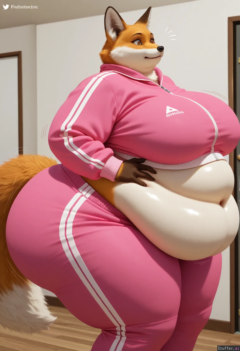 (photoRealistic), fox, furry, solo (Pink Tracksuit), (((fat, belly, thick thighs, wide hips, gigantic fat ass, thick breasts, weight again))), at home, front view, a surprised look