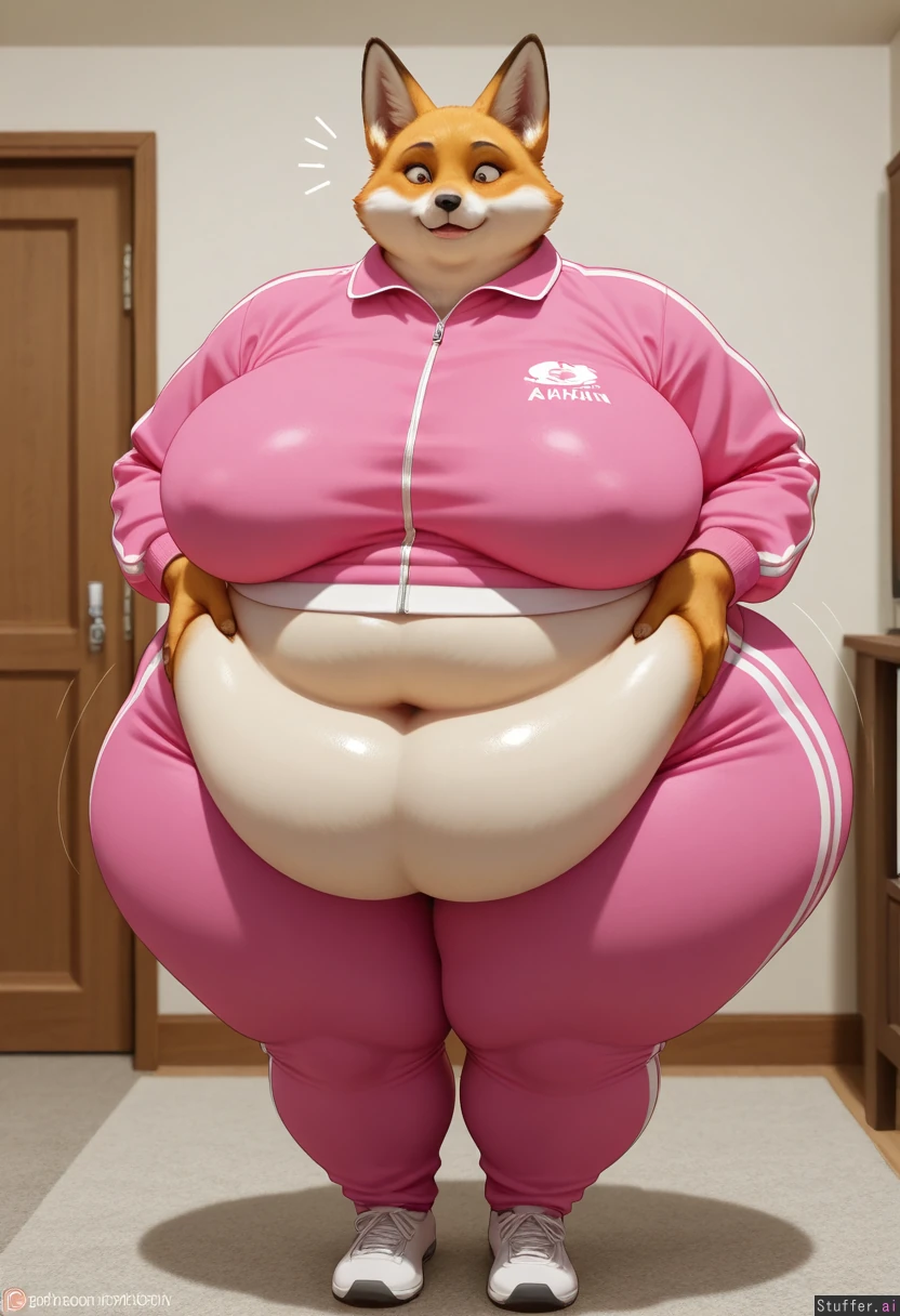 (photoRealistic), fox, furry, solo (Pink Tracksuit), (((fat, belly, thick thighs, wide hips, gigantic fat ass, thick breasts, weight again))), at home, front view, a surprised look