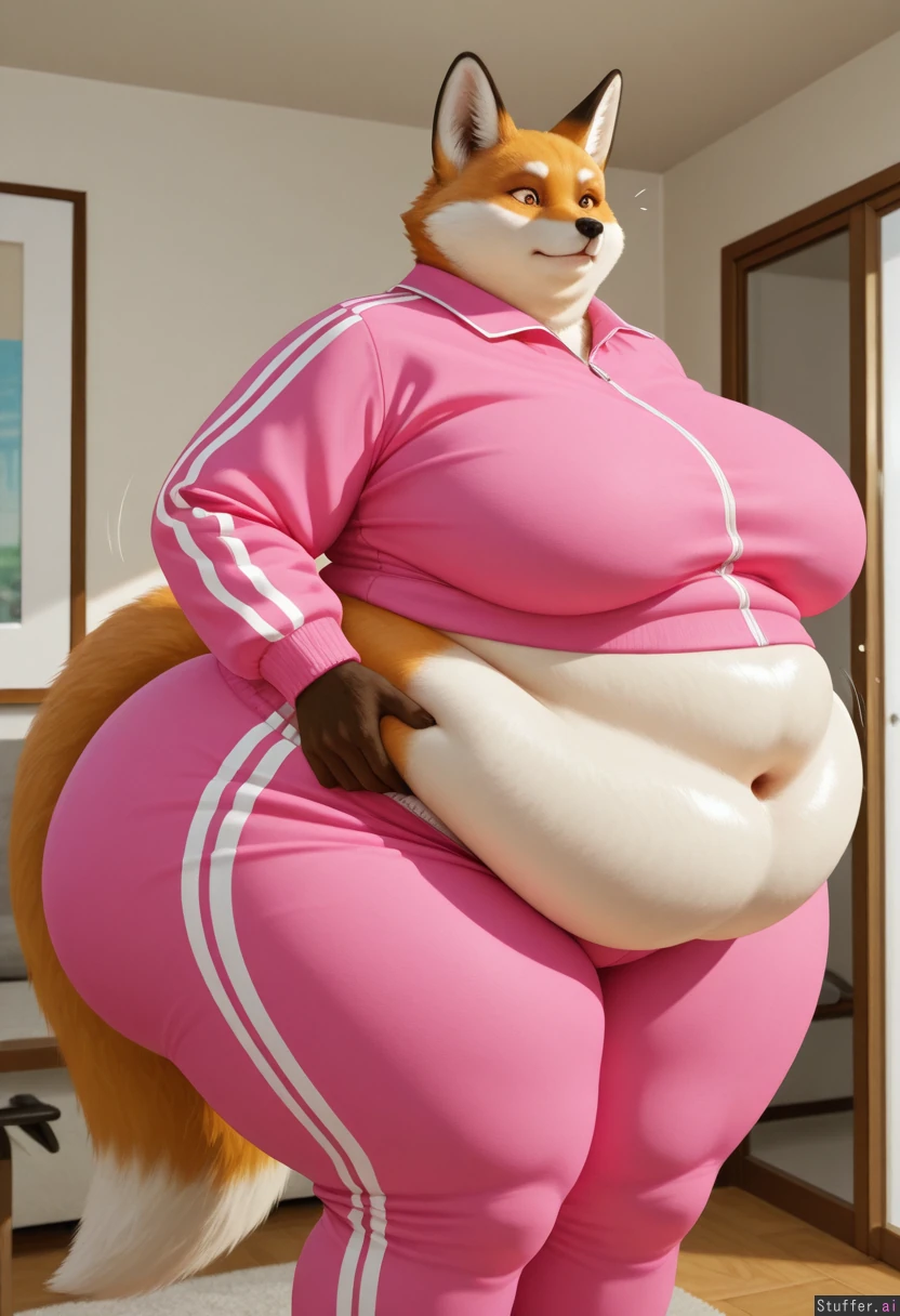 (photoRealistic), fox, furry, solo (Pink Tracksuit), (((fat, belly, thick thighs, wide hips, gigantic fat ass, thick breasts, weight again))), at home, front view, a surprised look