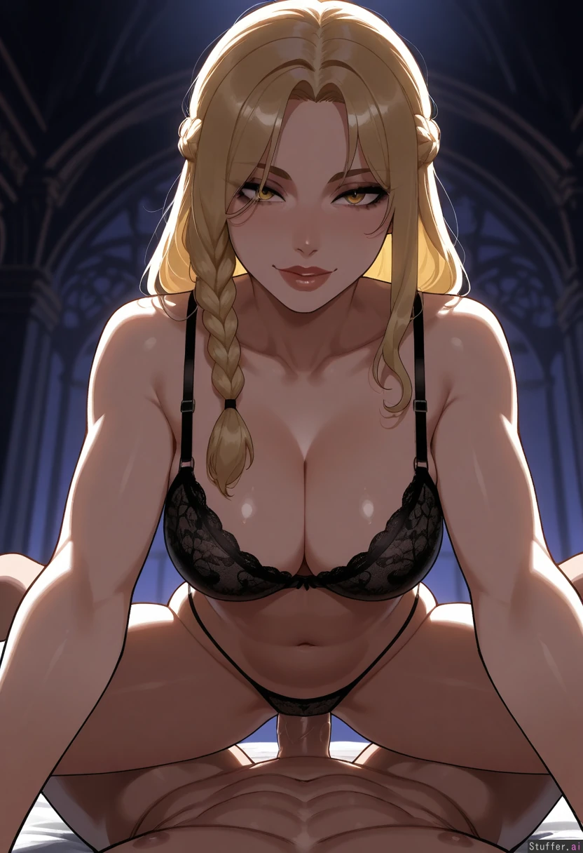 1woman, milf, adult, masterpiece, amazing resolution, nyantcha(artist), krekkov(artist), dramatic lighting, intricate details, detailed eyes, hdr, best quality, (soft shading), dim lighting, realistic lighting Character:queen_marika(elden_ring) Bedroom, dark purple lighting (long golden blond hair, braid, gold eyes), dark eyeshadow, sexy face, dominant, flirty, seductive slim, toned belly, Athletic build, abs line (black lace bra), black thong, (modest breasts), Slim waist, Lying down, legs on viewer shoulders, looking at viewer, facing_viewer elden_ring goddess glowing Missionary sex Sex Missionary penetration Penis in vagina POV Sex lying down Viewer standing, girl lying down missionary_position wild_arms