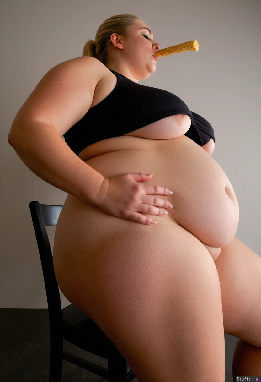 Young blonde woman, tan skin, looks like tate mcrae, Wearing black gym top and tight gym shorts, very skinny body, view from side, dark lighting, silhouette visible, slim ass and hips, hands holding breasts, rubbing oil on ass and body, wet body, sitting on tiny chair, ass hanging over sides of chair, view from front, eating massive cheese burger, fat belly overhanging, belly on thighs (Massive round belly: 2) (Thick thighs: 0.3) (Round natural ass: 0.4) (Overhanging ass: 1.8) (Round heavy breasts: 1.6)