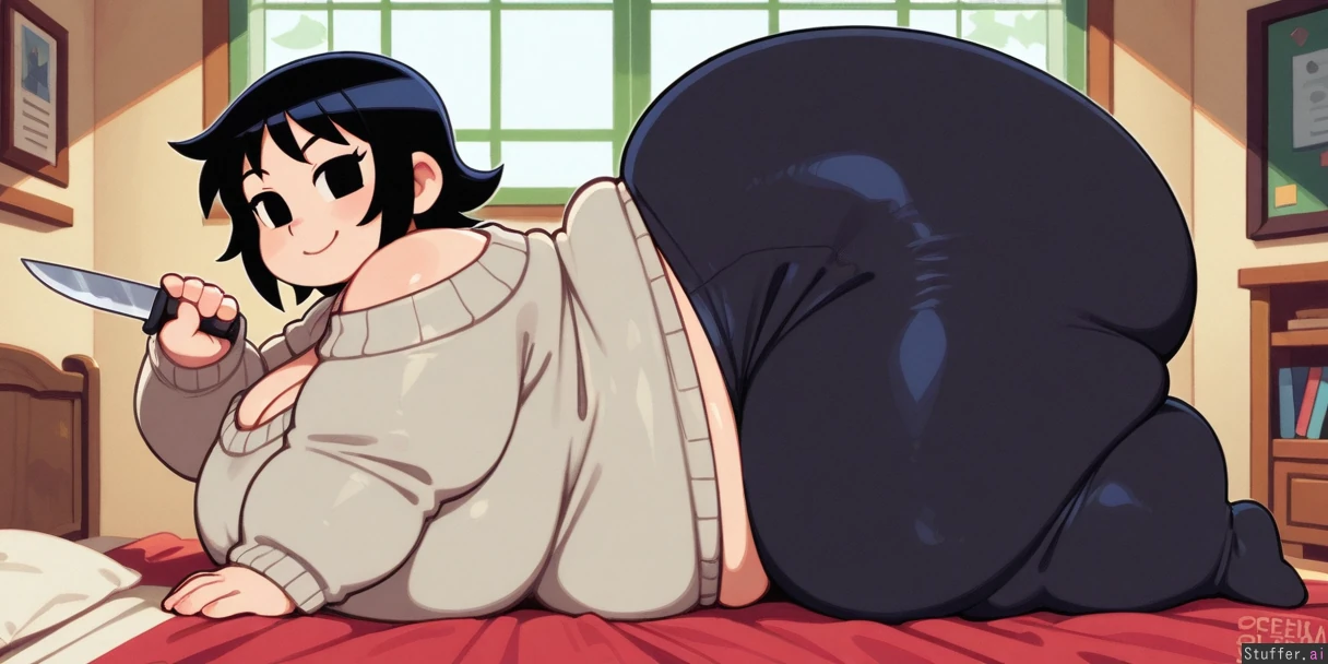 best quality, high quality, Speedoru(artist), wamudraws(artist), ((lineless:1.4)), vibrant colors, hard shading, posing, (1girl:1.4, solo), (flat colors), full_body_shot, ((Knives_Chau from Scott pilgrim, black hair, no sclera, black leggings, grey off-shoulder sweater)), on all fours, smiling at viewer, morbidly_obese, skindentation, ((hyper gigantic obese hips:1.4)), huge wide fat ass, bottom heavy, ((hyper gigantic obese thighs:1.4)), ((hyper gigantic obese butt:1.4)), ((hyper gigantic obese legs:1.4)), fat face, (((fat arms))), (hyper obese:1.6), ((hyper obese hips:1.4))((hyper obese thighs:1.4)), ((hyper obese butt:1.4)), weight_gain:1.4, fully clothed, laying on a bed, from side, side view, bedroom,