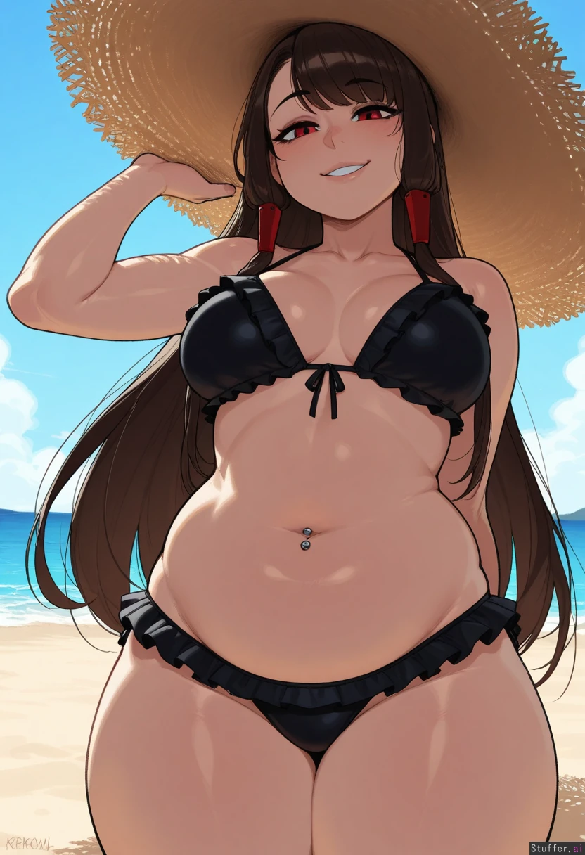 krekkov, KAMII MOMORU(artist), (highly detailed, best quality, masterpiece), (perfect anatomy, vibrant colours,, shadow, perfect shading), (beautiful face, beautiful eyes), (Akagi (Azur Lane)) Navel piercing, ((black frilly bikini)), medium breasts, sun setting, beach, Thick thighs, soft belly, bloated belly, ( confident, proud, seductive, horny)), (((She has gained a huge amount of weight giving her a round fat belly)))
