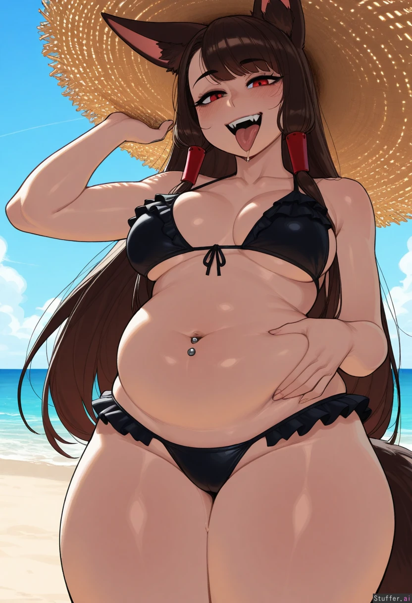 krekkov, KAMII MOMORU(artist), (highly detailed, best quality, masterpiece), (perfect anatomy, vibrant colours,, shadow, perfect shading), (beautiful face, beautiful eyes), (Akagi (Azur Lane)) Navel piercing, ((black frilly bikini)), medium breasts, sun setting, beach, Thick thighs, soft belly, bloated belly, ( confident, proud, seductive, horny)), (Open mouth, tongue out, slight blush), (Saliva strings, fangs), (Grabbing belly), (((She has gained a huge amount of weight giving her a round fat belly)))