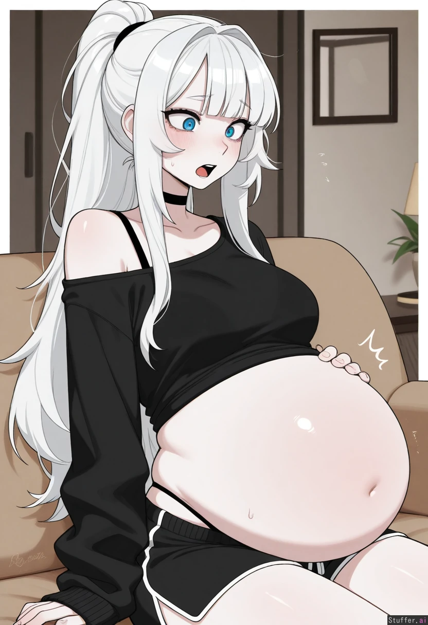 absurdres, 8k, perfect anatomy, masterpiece, beautiful face, beautiful eyes, RockSolidArt. /(artist/), RockSolidArt(artist/) ,8), (merunyaa), (usa37107692:1.2), (ohasi_art), (betterwithsalt), (flat color:1.5) (((solo))) Living room ((White hair, fluffy hair, fluffy ponytail, long hair, bangs, blue eyes, hair hides one eye, pale skin)) Goth, Black lipstick ((Baggy black_crop top, bare shoulder, plain_black shirt, loose shirt, long sleeves)), black bra, draw string shorts, low waist black short shorts, black panty straps, ((Blush, shock, embarrassment, open mouth)), sitting on couch, ((Full belly:1.9)), shocked, (hand on belly), looking down