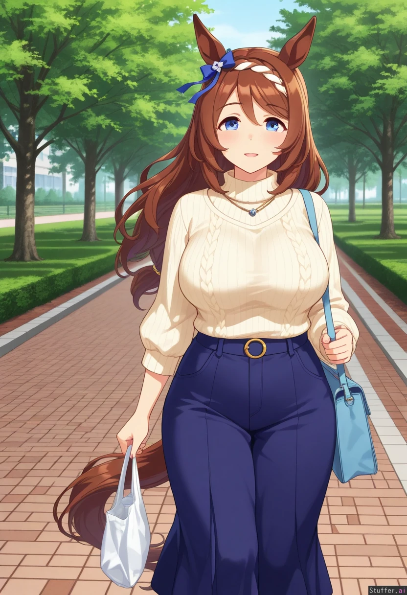 best quality, high quality, detailed face, detailed eyes, looking at viewer, walking, outside, park, (super_creek_(umamusume)), milf,