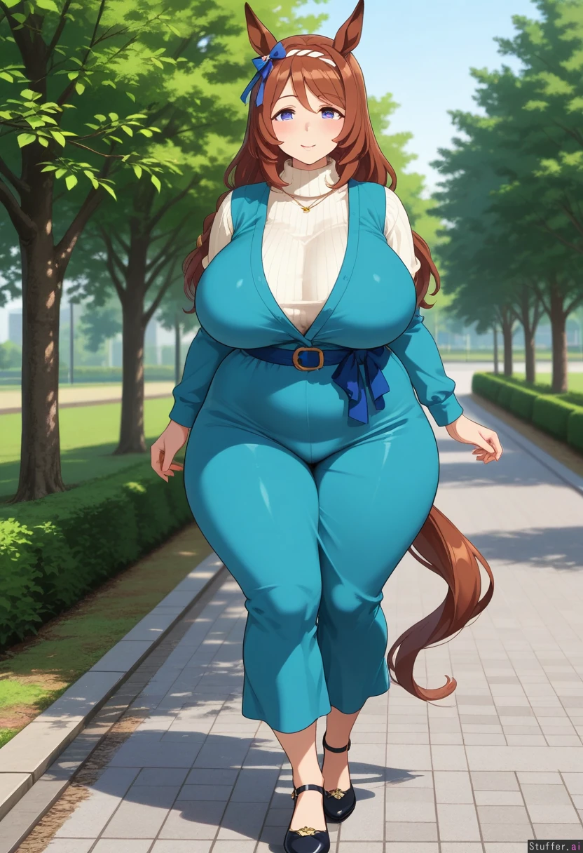 best quality, high quality, detailed face, detailed eyes, looking at viewer, walking, outside, park, (super_creek_(umamusume)), milf, voluptuous, cute, (expansion), (gigantic breasts:0.1), (gigantic ass:0.1),