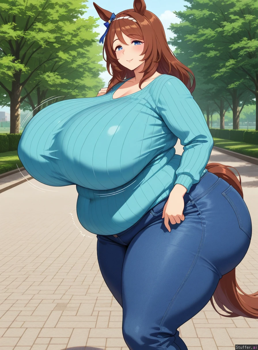 best quality, high quality, detailed face, detailed eyes, looking at viewer, walking, outside, park, (super_creek_(umamusume)), ((milf, tall, mature)), (extremely voluptuous), cute, (expansion, weight gain, breast expansion, ass expansion), fat, (gigantic breasts:0.9), (gigantic ass:0.9),