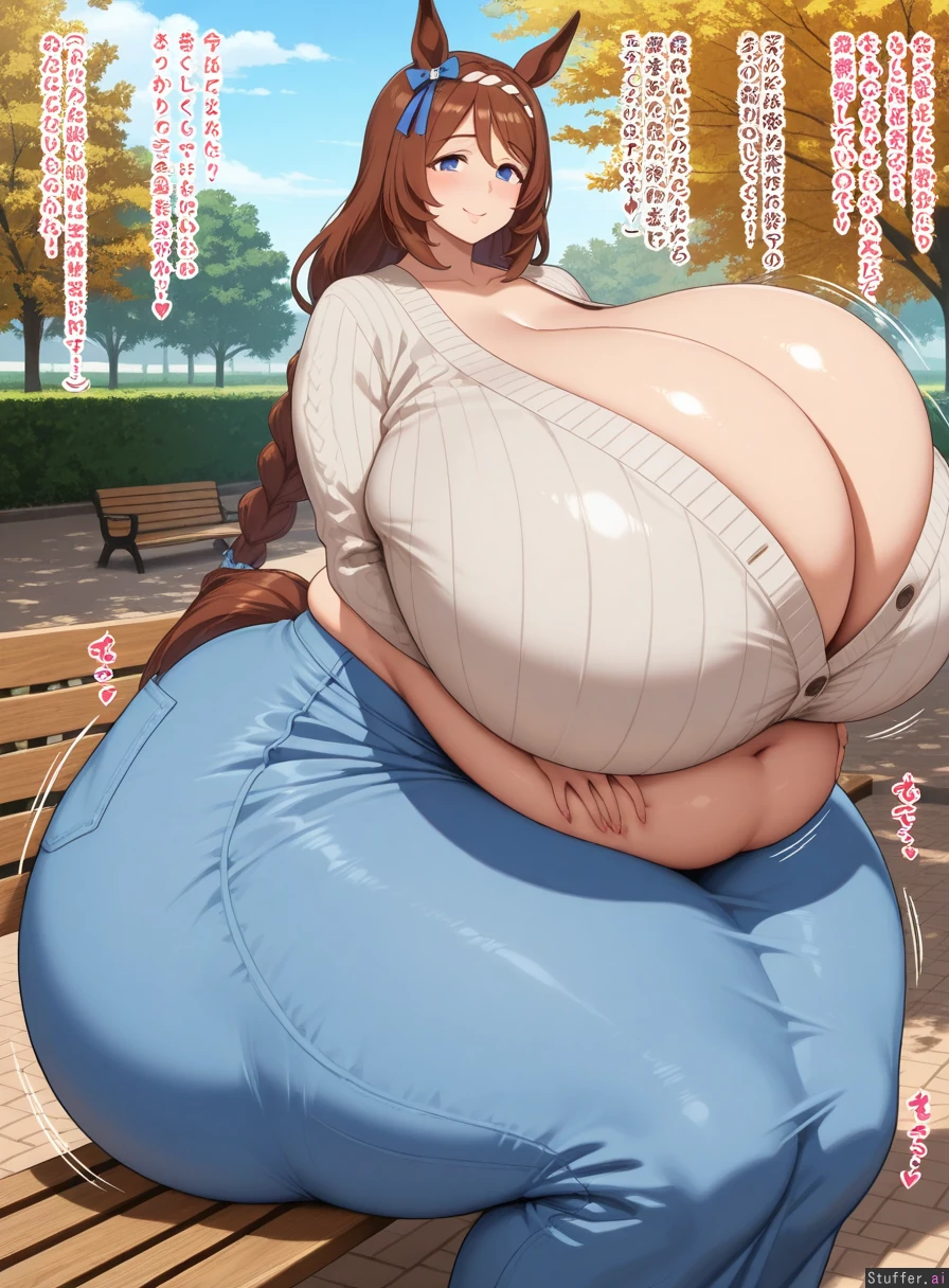 best quality, high quality, good anatomy, detailed face, detailed eyes, looking at viewer, bench, outside, park, (super_creek_(umamusume)), ((milf, tall, mature)), (hyper voluptuous, exaggerated proportions), cute, (expansion, growth, weight gain, breast expansion, ass expansion), morbidly obese, (hyper gigantic breasts:1.5), (hyper gigantic ass:1.5),