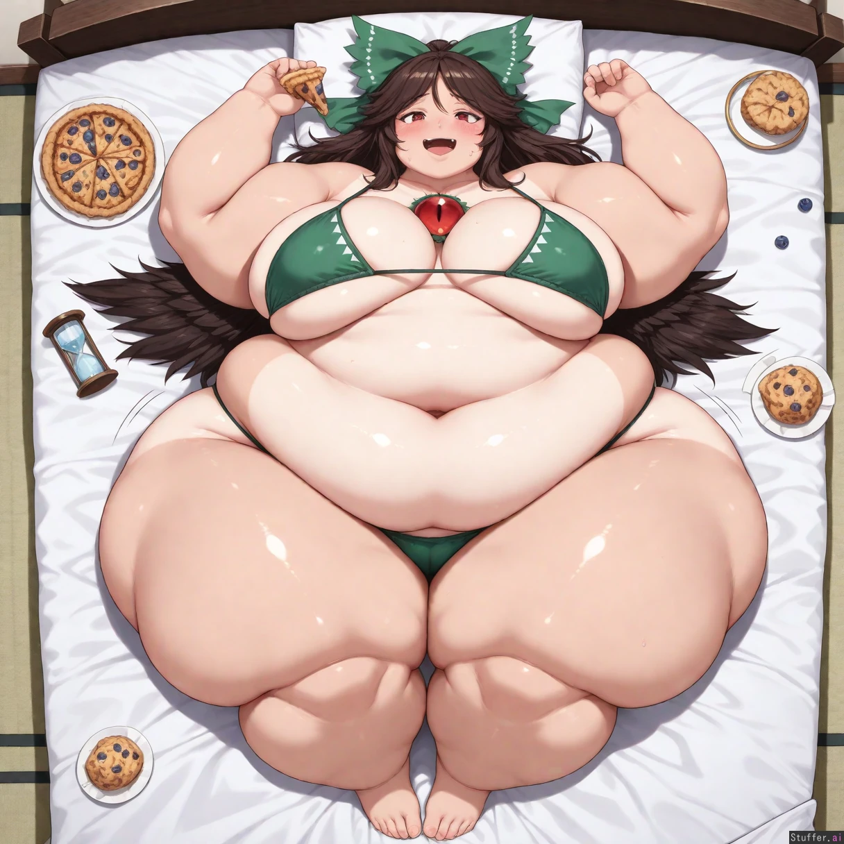 best quality,2D,8k, high rating, dynamic lighting, highly detailed, highly detailed background, highly detailed face, masterpiece, high rating, pupils, c.cu(artist),betterwithsalt(artist),mdf_an(artist),midnitemorty(artist),spellsx(artist),kurocaze (((utsuho reiuji, touhou, touhou project, red eyes, fangs, long dark brown hair with red tips, sharp eyes, big breasts, big ass, tall, hourglass figure, milf, cute, cute face, attractive, beautiful, sexy, outgoing, friendly, shy, awkward, airheaded, curvy, thicc, slight tan, plump, chubby, bbw, fat, soft body, pudgey, doughy, flabby, muffin top, happy, very embarrassed, having fun, flirting, horny))) ((simple dark green bikini)), ((very cute, sexy, beautiful face, highly detailed eyes)), (((1girl, solo, alone))) ((Lying in bed, lying on her back, surrounded by blueberry pies, eating a pie slice, relaxing, relaxed, lazy, indulging, indulgent, gluttonous)) ((Jiggling, wobbling, bouncing, jiggle lines)) (((Front view, view from above, view from far, full body view, zoomed out))) ((USSBBW,love handles,morbidly obese sagging belly,morbidly obese fat legs,morbidly obese fat thighs,morbidly obese fat ass,morbidly obese fat belly,morbidly obese fat arms))