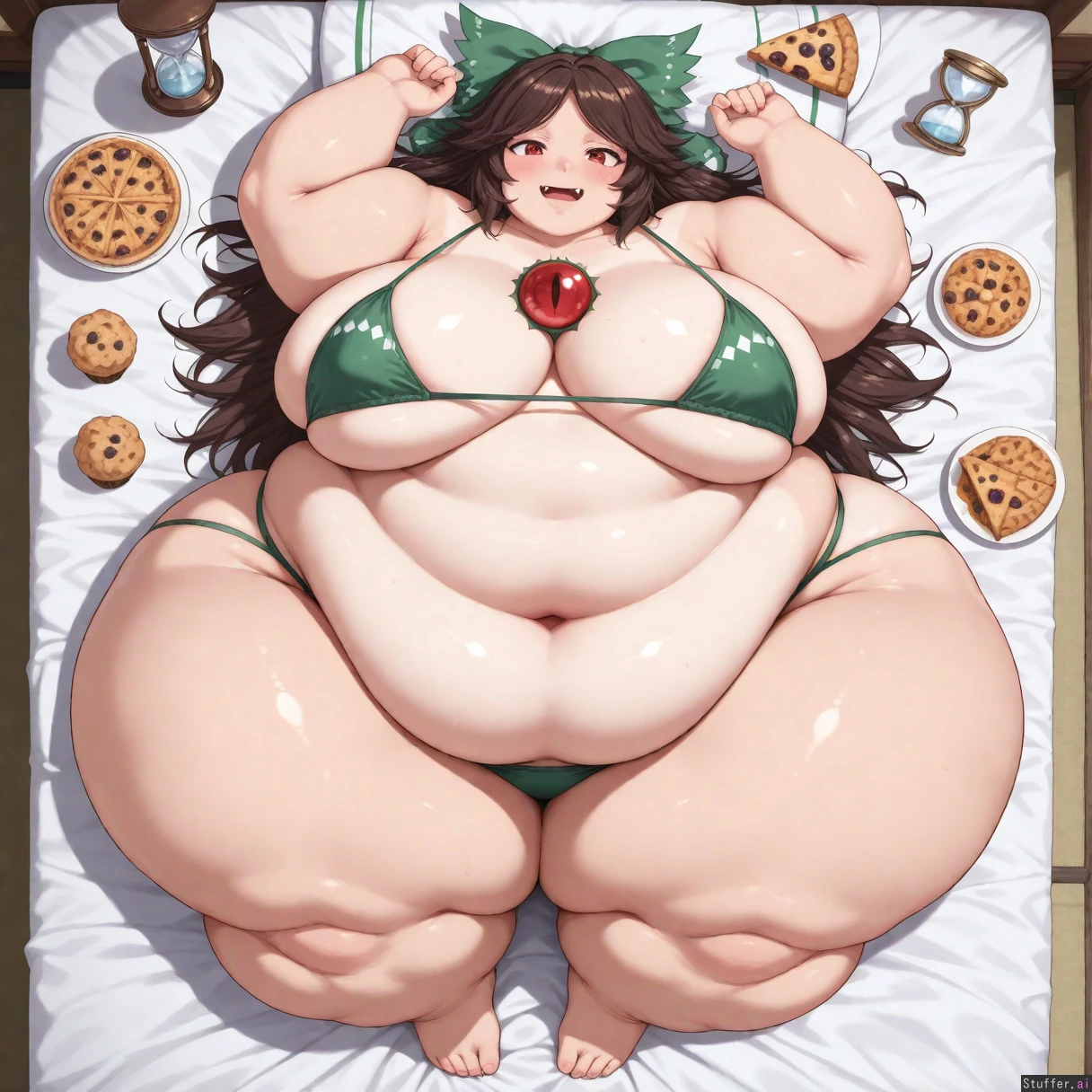 best quality,2D,8k, high rating, dynamic lighting, highly detailed, highly detailed background, highly detailed face, masterpiece, high rating, pupils, c.cu(artist),betterwithsalt(artist),mdf_an(artist),midnitemorty(artist),spellsx(artist),kurocaze (((utsuho reiuji, touhou, touhou project, red eyes, fangs, long dark brown hair with red tips, sharp eyes, big breasts, big ass, tall, hourglass figure, milf, cute, cute face, attractive, beautiful, sexy, outgoing, friendly, shy, awkward, airheaded, curvy, thicc, slight tan, plump, chubby, bbw, fat, soft body, pudgey, doughy, flabby, muffin top, happy, very embarrassed, having fun, flirting, horny))) ((simple dark green bikini)), ((very cute, sexy, beautiful face, highly detailed eyes)), (((1girl, solo, alone))) ((Lying in bed, lying on her back, surrounded by blueberry pies, eating a pie slice, relaxing, relaxed, lazy, indulging, indulgent, gluttonous)) ((Jiggling, wobbling, bouncing, jiggle lines)) (((Front view, view from above, view from far, full body view, zoomed out))) ((USSBBW,love handles,morbidly obese sagging belly,morbidly obese fat legs,morbidly obese fat thighs,morbidly obese fat ass,morbidly obese fat belly,morbidly obese fat arms))