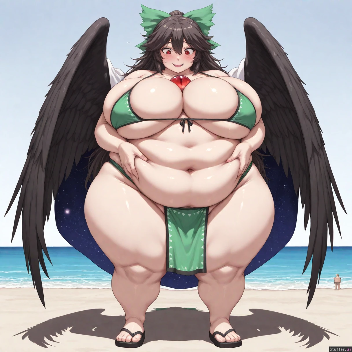 bestquality, highrating, absurdres, solo girl, 1woman, 1girl, one obese girl, highly detailed, highly detailed face, highly detailed eyes, pupils, dynamic lighting, masterpiece, (((Utsuho Reiuji, Touhou, sharp eyes, red eyes, fangs, massive breasts, tall, adult, milf, very cute, cute face, big navel, chubby, massive ass, thick thighs, raven wings)), (((Happy, very embarrassed, friendly, looking down at herself, grabbing her belly, blush)), (((Simple green bikini, sumo loincloth, sumo girl)), sandals, mdf_an(artist), midnitemorty(artist), ((Standing)), on beach, ((Bbw, ssbbw, ussbbw, fat, chubby, obese, morbidly obese, weight gain, immobile, 1000 pounds, double chin)), ((Front view, view from far, full body view))