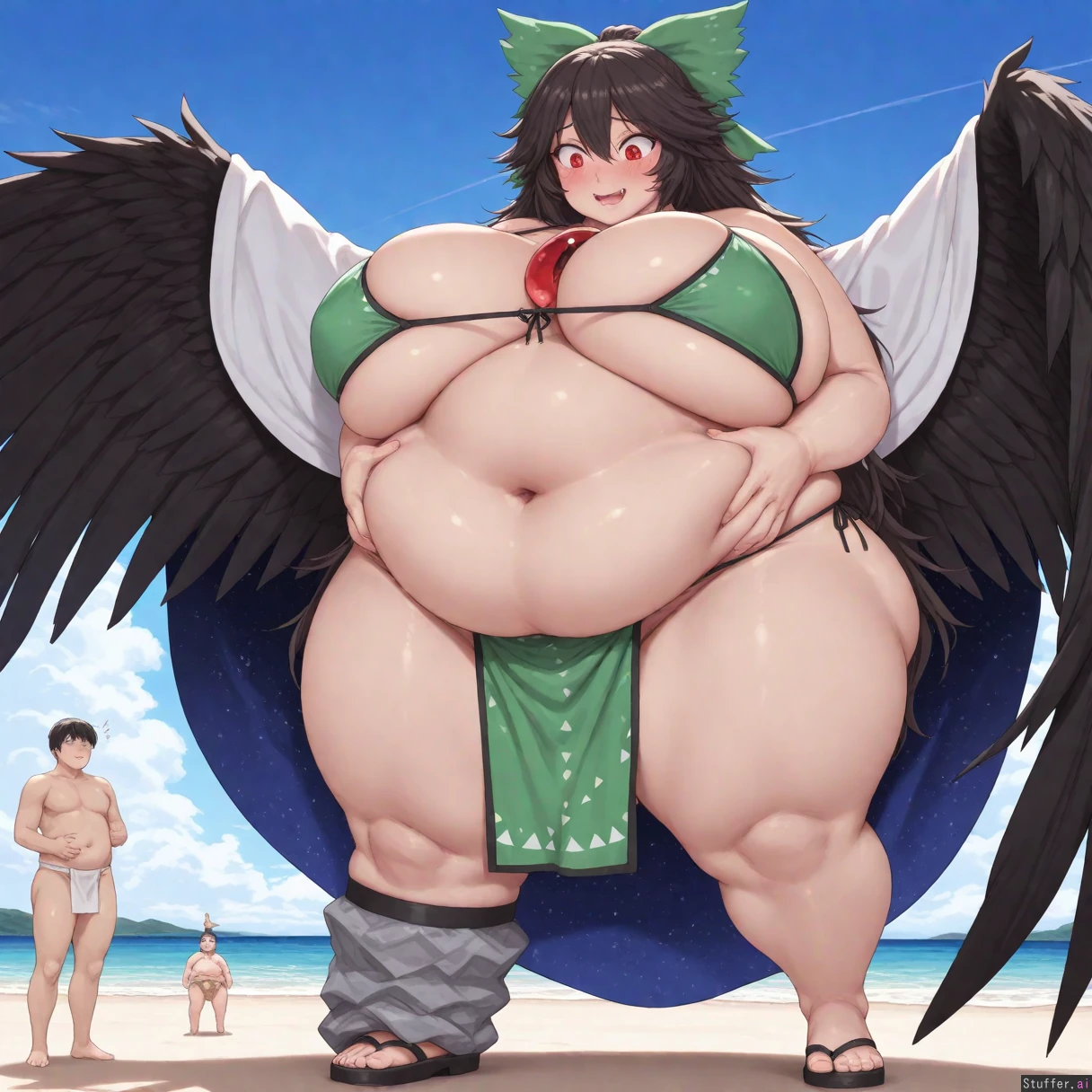 bestquality, highrating, absurdres, solo girl, 1woman, 1girl, one obese girl, highly detailed, highly detailed face, highly detailed eyes, pupils, dynamic lighting, masterpiece, (((Utsuho Reiuji, Touhou, sharp eyes, red eyes, fangs, massive breasts, tall, adult, milf, very cute, cute face, big navel, chubby, massive ass, thick thighs, raven wings)), (((Happy, very embarrassed, friendly, looking down at herself, grabbing her belly, blush)), (((Simple green bikini, sumo loincloth, sumo girl)), sandals, mdf_an(artist), midnitemorty(artist), ((Standing)), on beach, ((Bbw, ssbbw, ussbbw, fat, chubby, obese, morbidly obese, weight gain, immobile, 1000 pounds, double chin)), ((Front view, view from far, full body view))