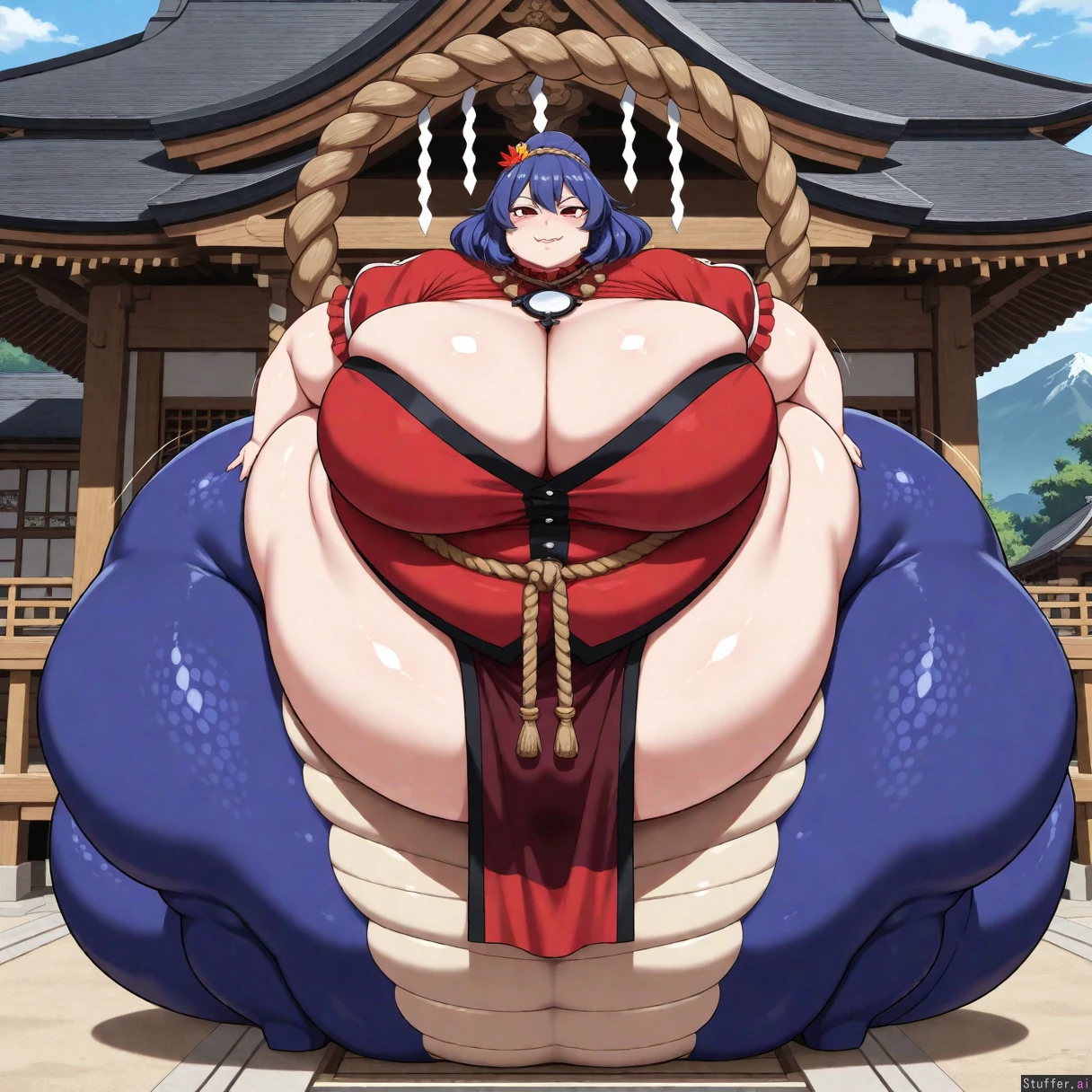 bestquality, highrating, absurdres, 1woman, 1 person, solo, alone, dynamic lighting, masterpiece, ((Kanako Yasaka, Touhou, short dark blue hair, sharp snake eyes, fangs, big chest, tall, cute, thicc thighs, fat, bbw, obese, ssbbw, morbidly obese, ussbbw, big, curvy, sexy, horny, friendly, milf, snake girl, lamia lower body, no legs, no feet,)), flabby arms, sudden weight gain, sudden fattening, suddenly fat, suddenly obese, (massive hips:1.7), (double chin), (chubby face), bbw, ssbbw, ussbbw, blob, 600 pounds, (((morbidly obese, weight gain))), overweight, love_handles, bingo_wings, fat_arms, ((dark red loincloth with black trim, prayer rope)), ((cleavage)), (((Standing, at the Moriya Shrine, outdoors, on a mountain))), betterwithsalt(artist), c.cu(artist), opik-oort(artist), anime style, manga style, Jiggling, wobbling, bouncing, jiggle lines, motion lines, wobble lines, (((view from front, full body view, full body visible))),
