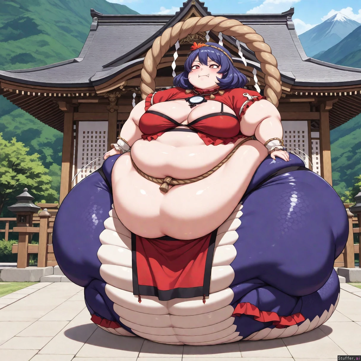 bestquality, highrating, absurdres, 1woman, 1 person, solo, alone, dynamic lighting, masterpiece, short, ((Kanako Yasaka, Touhou, short dark blue hair, sharp snake eyes, fangs, small breasts, sagging_breasts, cute, thicc thighs, fat, bbw, obese, ssbbw, morbidly obese, ussbbw, big, curvy, sexy, horny, friendly, milf, snake girl, lamia lower body, no legs, no feet,)), flabby arms, sudden weight gain, sudden fattening, suddenly fat, suddenly obese, (massive hips:1.7), (double chin), (chubby face), bbw, ssbbw, ussbbw, blob, 600 pounds, (((morbidly obese, weight gain))), overweight, love_handles, bingo_wings, fat_arms, ((dark red loincloth with black trim, prayer rope)), ((cleavage)), (((Standing, at the Moriya Shrine, outdoors, on a mountain))), betterwithsalt(artist), c.cu(artist), opik-oort(artist), anime style, manga style, Jiggling, wobbling, bouncing, jiggle lines, motion lines, wobble lines, (((view from front, full body view, full body visible))),