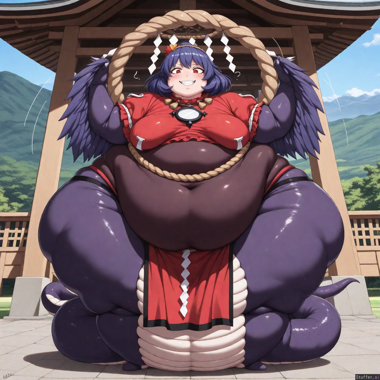 bestquality, highrating, absurdres, 1woman, 1 person, solo, alone, dynamic lighting, masterpiece, short, ((Kanako Yasaka, Touhou, short dark blue hair, sharp snake eyes, fangs, small breasts, sagging_breasts, cute, thicc thighs, fat, bbw, obese, ssbbw, morbidly obese, ussbbw, big, curvy, sexy, horny, friendly, milf, snake girl, lamia lower body, no legs, no feet, dumb grin, confused, winged_arms)), flabby arms, sudden weight gain, sudden fattening, suddenly fat, suddenly obese, (massive hips:1.7), (double chin), (chubby face), bbw, ssbbw, ussbbw, blob, 600 pounds, (((morbidly obese, weight gain))), overweight, love_handles, bingo_wings, fat_arms, ((dark red loincloth with black trim, prayer rope)), (((Standing, at the Moriya Shrine, outdoors, on a mountain))), betterwithsalt(artist), c.cu(artist), opik-oort(artist), anime style, manga style, Jiggling, wobbling, bouncing, jiggle lines, motion lines, wobble lines, (((view from front, full body view, full body visible))),