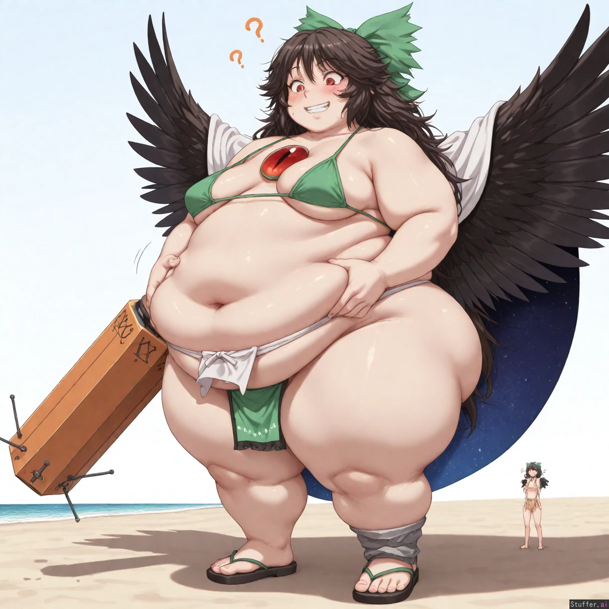 bestquality, highrating, absurdres, solo, 1woman, obese, highly detailed, highly detailed face, highly detailed eyes, pupils, dynamic lighting, masterpiece, (((Utsuho Reiuji, Touhou, sharp eyes, red eyes, fangs, adult, milf, very cute, cute face, chubby, massive ass, thick thighs, raven wings, small breasts, sagging_breasts, )), (((confused, dumb grin, very embarrassed, friendly, looking down at herself, grabbing her belly, blush)), (((Simple green bikini, sumo loincloth, sumo girl)), sandals, mdf_an(artist), midnitemorty(artist), ((Standing)), on beach, ((Bbw, ssbbw, ussbbw, fat, chubby, obese, morbidly obese, weight gain, immobile, 2000 pounds, double chin)), ((Front view, full body view))