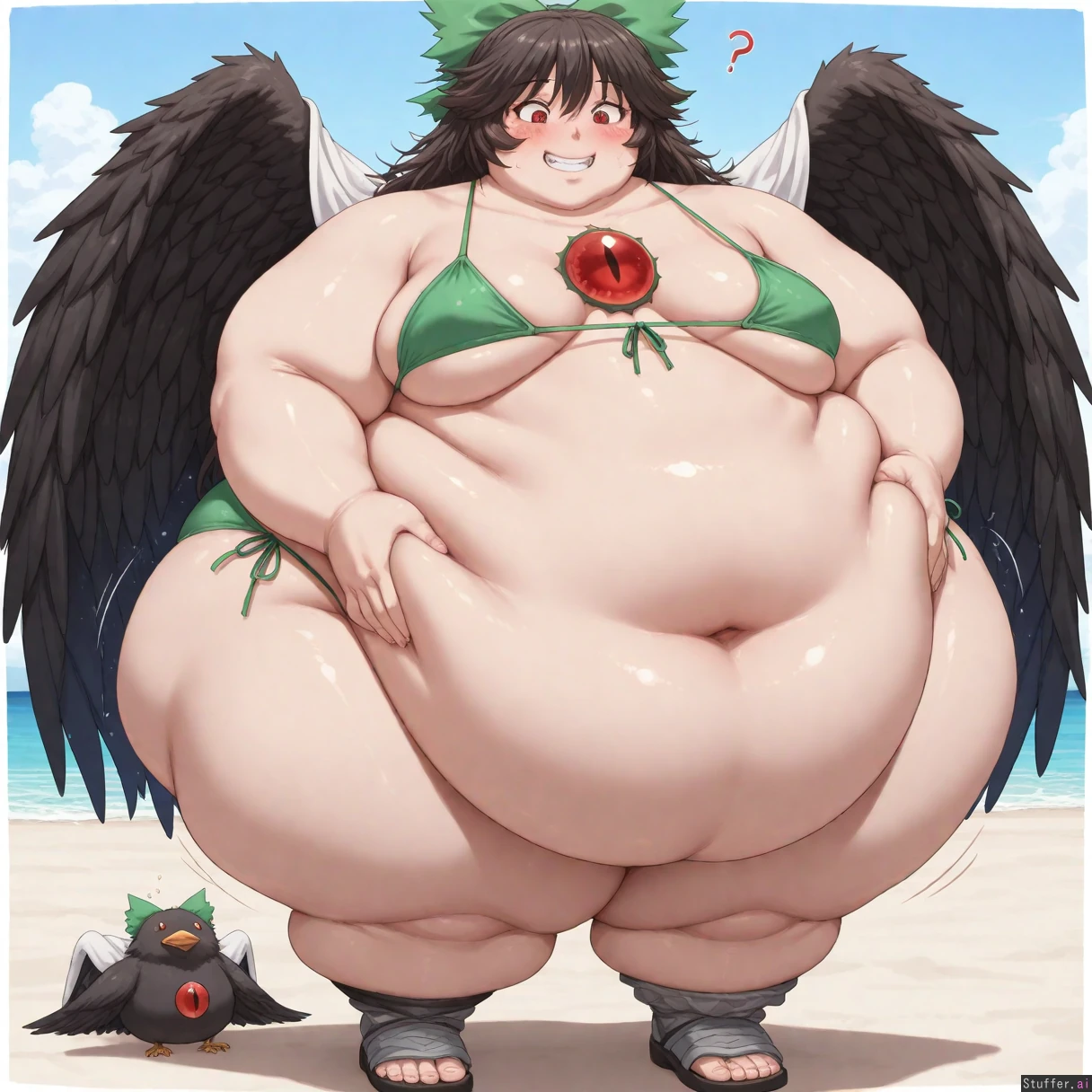 bestquality, highrating, absurdres, solo, 1woman, obese, highly detailed, highly detailed face, highly detailed eyes, pupils, dynamic lighting, masterpiece, (((Utsuho Reiuji, Touhou, sharp eyes, red eyes, fangs, adult, milf, very cute, cute face, chubby, massive ass, thick thighs, raven wings, small breasts, sagging_breasts, )), (((confused, dumb grin, very embarrassed, friendly, looking down at herself, grabbing her belly, blush)), (((Simple green bikini)), sandals, mdf_an(artist), midnitemorty(artist), ((Standing)), on beach, ((Bbw, ssbbw, ussbbw, fat, chubby, obese, morbidly obese, weight gain, immobile, 2000 pounds, double chin)), flabby arms, sudden weight gain, sudden fattening, suddenly fat, suddenly obese, (Belly expansion), belly, ((bloated belly)), ((belly squish)), ((bigger ass)), hyper_belly, hyper_ass, (((distended belly))), rapid weight gain, (massive hips:1.7), (double chin), (chubby face), ((stuffed belly:1.3)), motion lines around belly, smooth skin, underbelly, underboob, belly jiggling, belly bouncing, fattening, fat face, double chin, chubby cheeks, fat and swollen, obese, morbidly obese, fat inflation, bbw, ssbbw, ussbbw, grabbing her belly fat round face, double_chin,ssbbw, (((morbidly obese, weight gain))), overweight, love_handles, bingo_wings, fat_arms, ((Front view, full body view))
