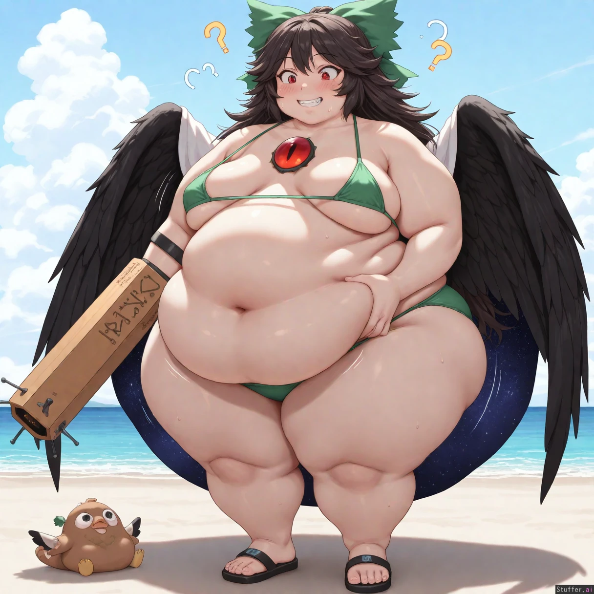 bestquality, highrating, absurdres, solo, 1woman, obese, highly detailed, highly detailed face, highly detailed eyes, pupils, dynamic lighting, masterpiece, short, (((Utsuho Reiuji, Touhou, sharp eyes, red eyes, fangs, adult, milf, very cute, cute face, chubby, massive ass, thick thighs, raven wings, small breasts, sagging_breasts, )), (((confused, dumb grin, very embarrassed, friendly, looking down at herself, grabbing her belly, blush)), (((Simple green bikini)), sandals, mdf_an(artist), midnitemorty(artist), ((Standing)), on beach, ((Bbw, ssbbw, ussbbw, fat, chubby, obese, morbidly obese, weight gain, immobile, 2000 pounds, double chin)), flabby arms, sudden weight gain, sudden fattening, suddenly fat, suddenly obese, (Belly expansion), belly, ((bloated belly)), ((belly squish)), ((bigger ass)), hyper_belly, hyper_ass, (((distended belly))), rapid weight gain, (massive hips:1.7), (double chin), (chubby face), ((stuffed belly:1.3)), motion lines around belly, smooth skin, underbelly, underboob, belly jiggling, belly bouncing, fattening, fat face, double chin, chubby cheeks, fat and swollen, obese, morbidly obese, fat inflation, bbw, ssbbw, ussbbw, grabbing her belly fat round face, double_chin,ssbbw, (((morbidly obese, weight gain))), overweight, love_handles, bingo_wings, fat_arms, ((Front view, full body view))