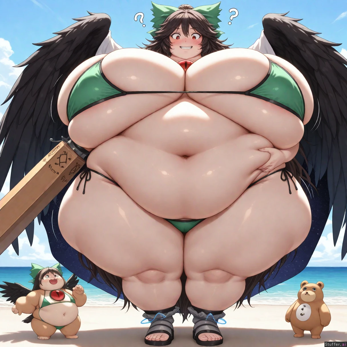 bestquality, highrating, absurdres, solo, 1woman, obese, highly detailed, highly detailed face, highly detailed eyes, pupils, dynamic lighting, masterpiece, short, (((Utsuho Reiuji, Touhou, sharp eyes, red eyes, fangs, adult, milf, very cute, cute face, chubby, massive ass, thick thighs, raven wings, gigantic breasts, sagging_breasts, )), (((confused, dumb grin, very embarrassed, friendly, looking down at herself, grabbing her belly, blush)), (((Simple green bikini)), sandals, mdf_an(artist), midnitemorty(artist), ((Standing)), on beach, ((Bbw, ssbbw, ussbbw, fat, chubby, obese, morbidly obese, weight gain, immobile, 2000 pounds, double chin)), flabby arms, sudden weight gain, sudden fattening, suddenly fat, suddenly obese, (Belly expansion), belly, ((bloated belly)), ((belly squish)), ((bigger ass)), hyper_belly, hyper_ass, (((distended belly))), rapid weight gain, (massive hips:1.7), (double chin), (chubby face), ((stuffed belly:1.3)), motion lines around belly, smooth skin, underbelly, underboob, belly jiggling, belly bouncing, fattening, fat face, double chin, chubby cheeks, fat and swollen, obese, morbidly obese, fat inflation, bbw, ssbbw, ussbbw, grabbing her belly fat round face, double_chin,ssbbw, (((morbidly obese, weight gain))), overweight, love_handles, bingo_wings, fat_arms, ((Front view, full body view))