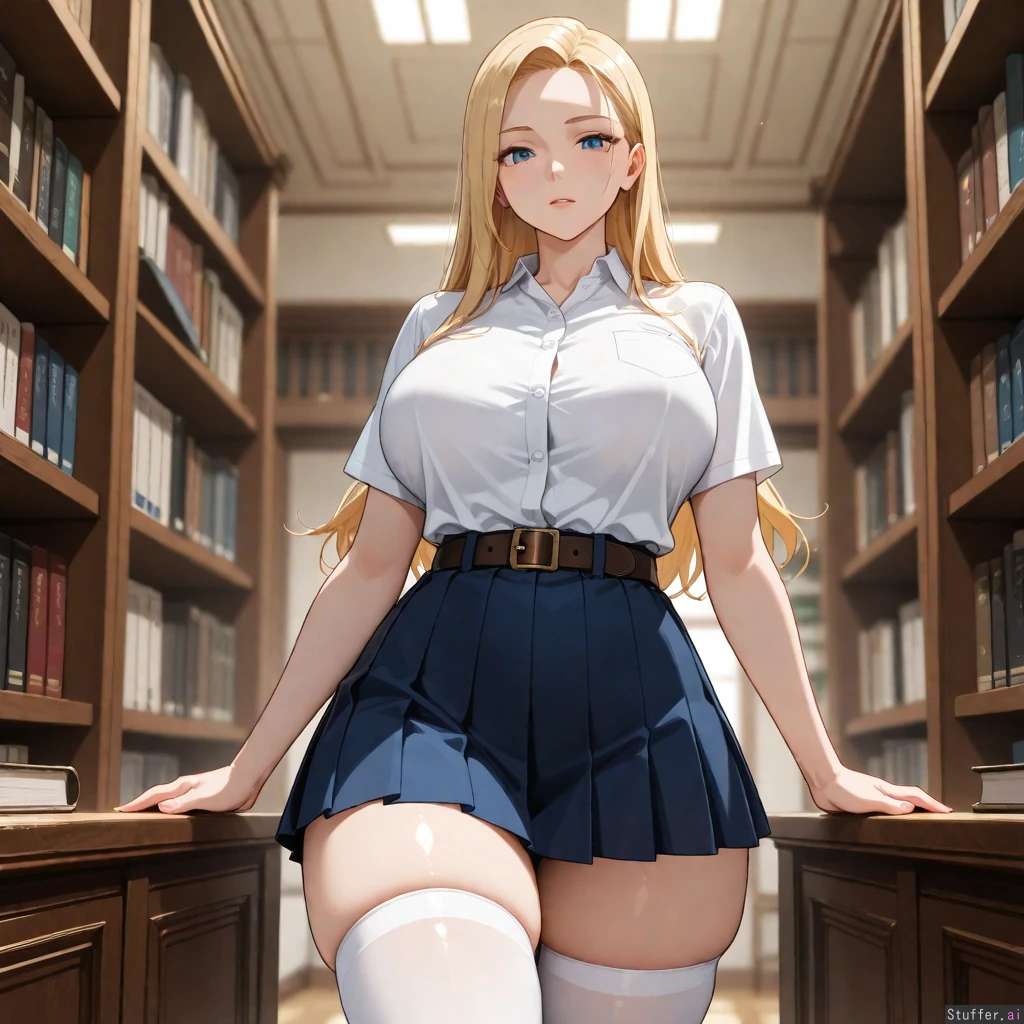blonde_female, blue_eyes, slender, petite, tall_female, blue_pleated_miniskirt, white_thighhighs, white_shirt, short_sleeves, collared_shirt, leather_belt, library