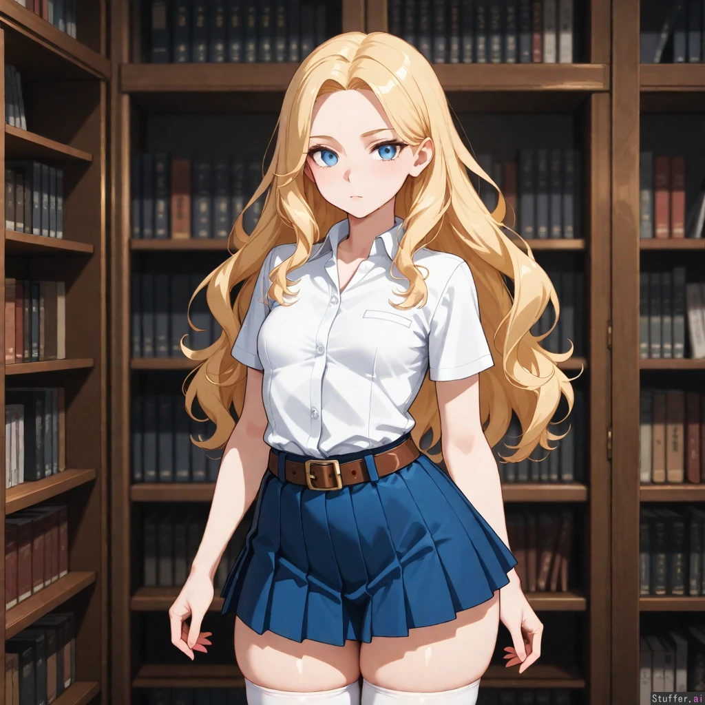 solo_female, tall_female, small_breasts, narrow_hips, petite, wavy_blonde_hair, blue_eyes, blue_pleated_miniskirt, white_thighhighs, white_shirt, short_sleeves, collared_shirt, leather_belt, library