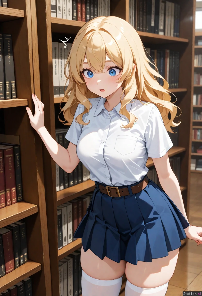 solo_female, tall_female, medium_breasts, medium_thighs, medium_hips, wavy_blonde_hair, blue_eyes, blue_pleated_miniskirt, white_thighhighs, white_shirt, short_sleeves, collared_shirt, leather_belt, library, surprised,