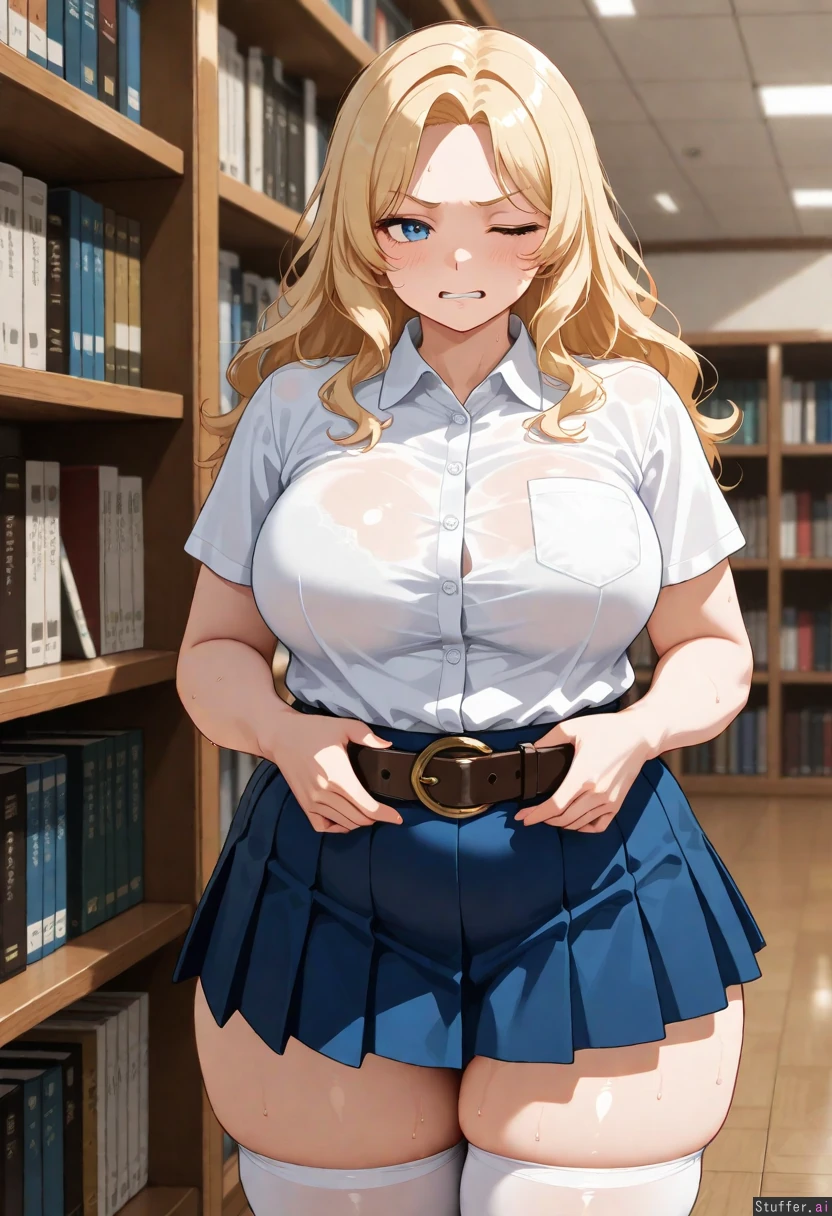 solo_female, tall_female, medium_breasts, medium_thighs, medium_hips, wavy_blonde_hair, blue_eyes, blue_pleated_miniskirt, white_thighhighs, white_shirt, short_sleeves, collared_shirt, leather_belt, library, tight_belt, one_eye_closed, sweaty, clenched_teeth, hands_on_belt, chubby, expansion