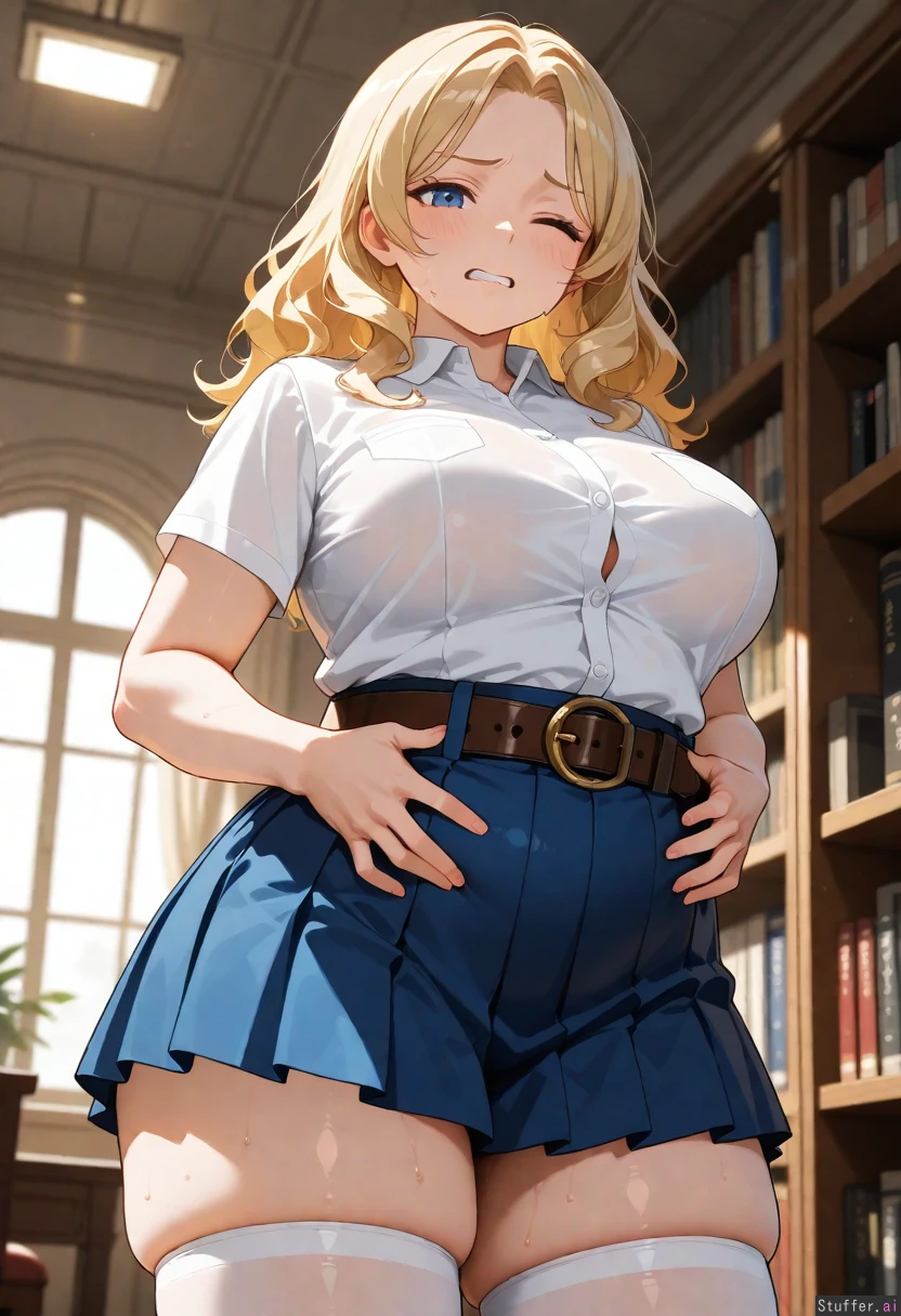 solo_female, tall_female, medium_breasts, medium_thighs, medium_hips, wavy_blonde_hair, blue_eyes, blue_pleated_miniskirt, white_thighhighs, white_shirt, short_sleeves, collared_shirt, leather_belt, library, tight_belt, one_eye_closed, sweaty, clenched_teeth, hands_on_belt, chubby, expansion, worried, looking_down