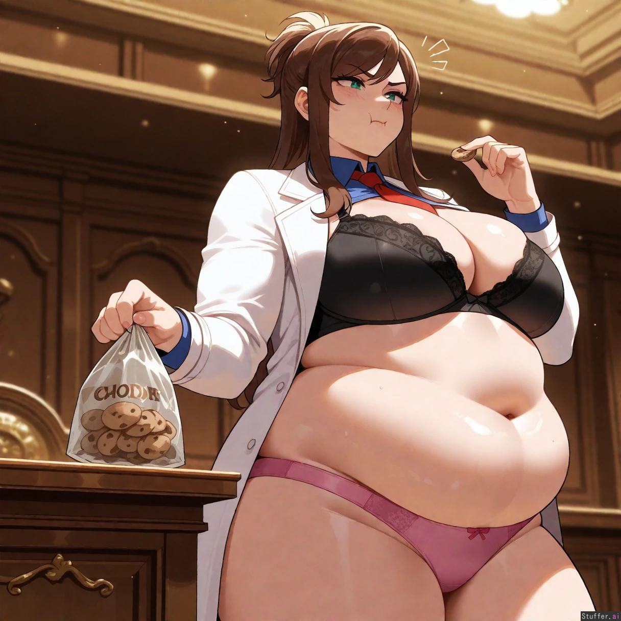 Masterpiece, best_quality, beautiful, vibrant colors, dim light, (1girl), alone, nyantcha(artist), Ema Skye, red tie, white coat, teal eyes, low angle, pouting, annoyed, eating chocolate chip, holding chips bag, courtroom, pink panties, black bra, (overweight:1.7)