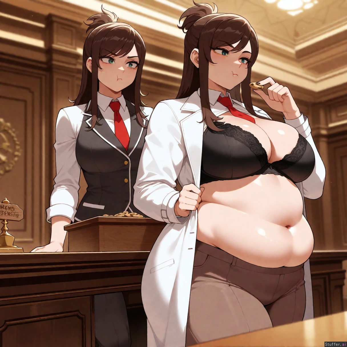 Masterpiece, best_quality, beautiful, vibrant colors, dim light, (1girl), alone, nyantcha(artist), Ema Skye, brown capri pants, red tie, white coat, teal eyes, low angle, pouting, annoyed, eating chocolate chip, courtroom, black bra, (overweight:1.6)