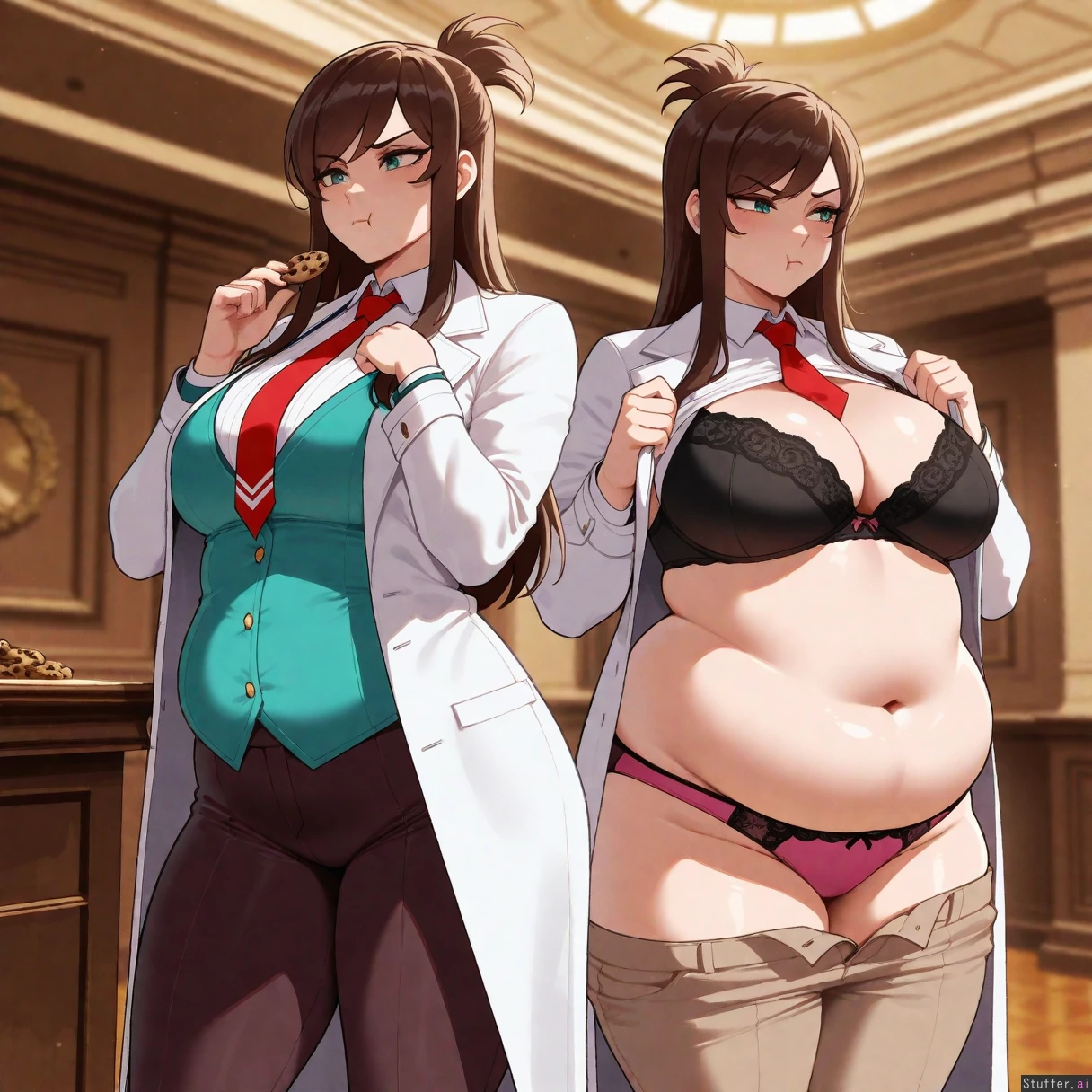 Masterpiece, best_quality, beautiful, vibrant colors, dim light, (1girl), alone, nyantcha(artist), Ema Skye, unbuttoned brown capri pants, red tie, white coat, teal eyes, low angle, pouting, annoyed, eating chocolate chip, courtroom, black bra, pink panties, (overweight:1.6)