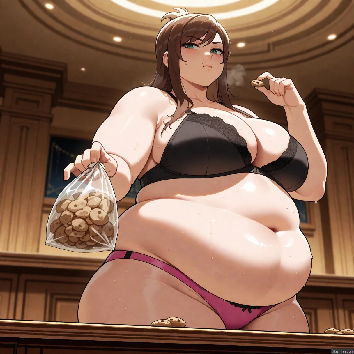 Masterpiece, best_quality, beautiful, vibrant colors, dim light, (1girl), alone, nyantcha(artist), Ema Skye, teal eyes, low angle, pouting, annoyed, eating chocolate chip, holding chips bag, courtroom, black bra, pink panties, sweating, panting, out of breath, (overweight:2.0)