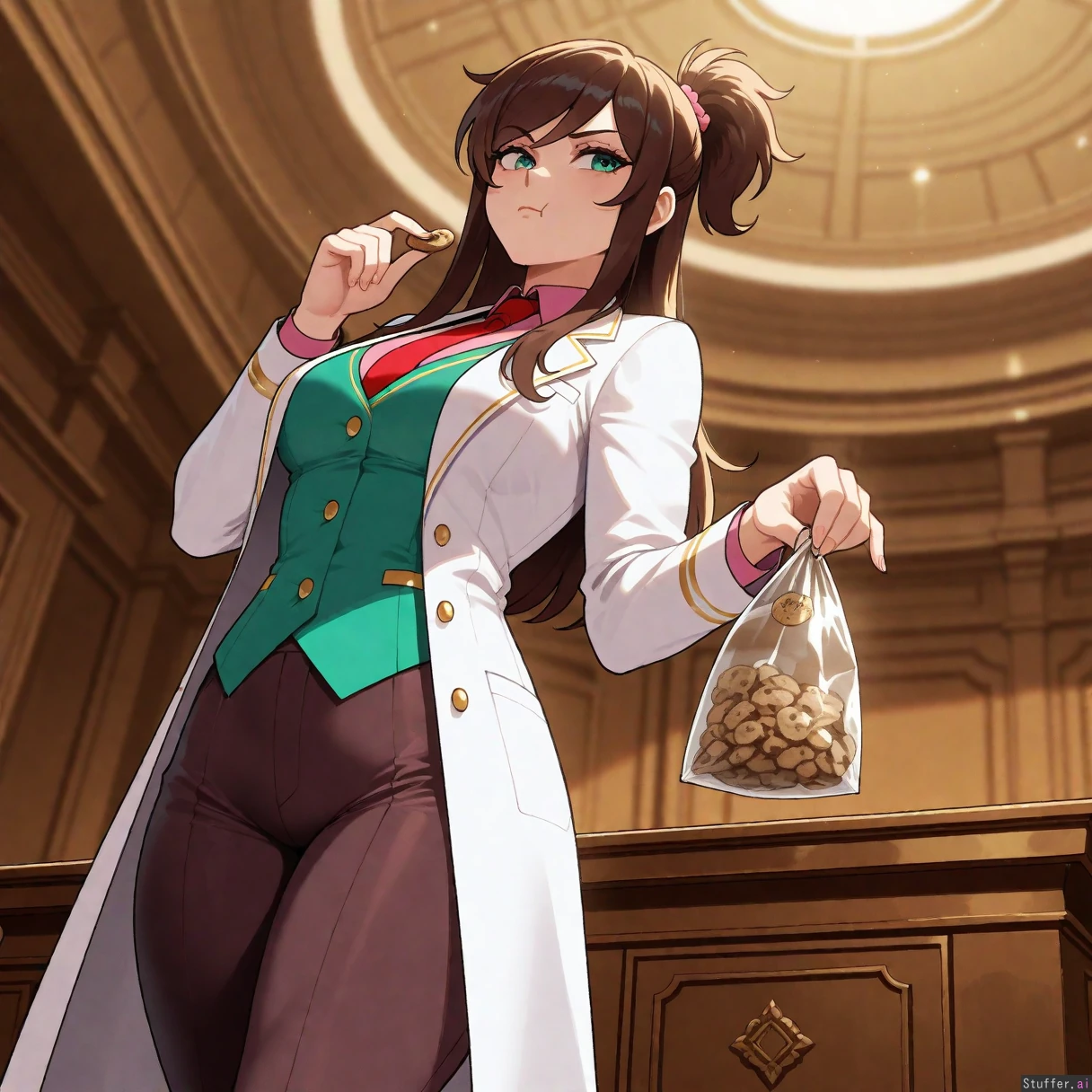 Masterpiece, best_quality, beautiful, vibrant colors, dim light, (1girl), alone, nyantcha(artist), Ema Skye, pink shirt, green vest with gold buttons, brown capri pants, red tie, white coat, teal eyes, low angle, pouting, annoyed, eating chocolate chip, holding chips bag, courtroom, (overweight:0.5)