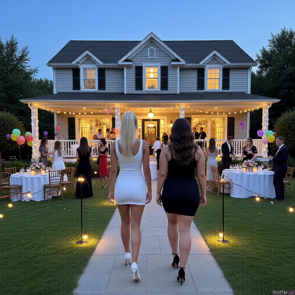 The girls are walking away towards a free standing american house. At the house is a party.