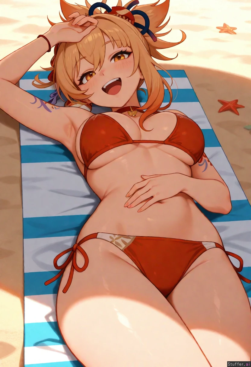 yoimiya_(genshin_impact),best quality , smooth skin ,(khyle(artist):0.6) , (masterpiece), (gardegu /(artist/):1.1), (blushyspicy(artist):0.7) , (usa37107692:0.5) ,1girl, solo, bikini, beach , (medium_breasts), petite,laying_on_belly, relaxing , open_mouth , smile,