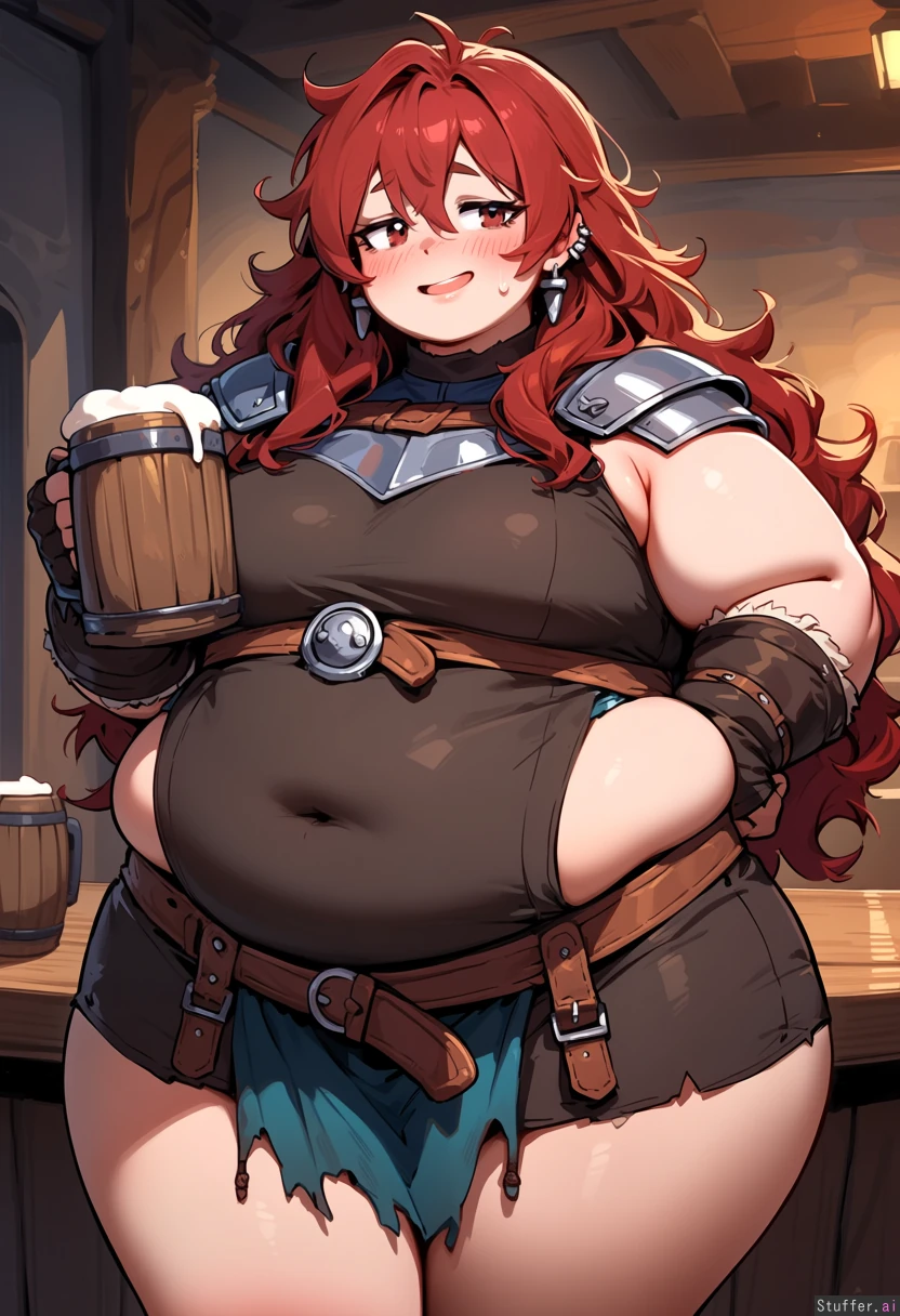 shy barbarian woman glances at you from across the tavern. very tall, long messy red hair, fingerless gloves. solid tattered kilt with large belt with round belt buckle and sporran. leather clothes and straps. armor on shoulders. multiple earrings. overweight, heavy, soft. big soft belly, gained weight, very fat. friendly. blushing. holding large stein of beer, one hand behind her back