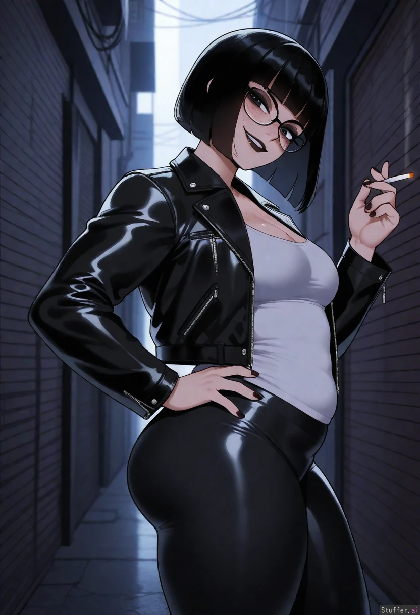 (( solo, nyantcha)) (( Goth, bob_cut, freckles, glasses, black_lipstick, black_eyeshadow)) (( leather_jacket, white_tank_top, leggings)) (( Medium_breasts:1.0)) (( Chubby belly:0.8)) (( Thick_thighs:1.0)) (( moonlight, smirk, holding_cigarette, head_tilt, side_view, alley, looking_at_viewer, hand_on_hip))