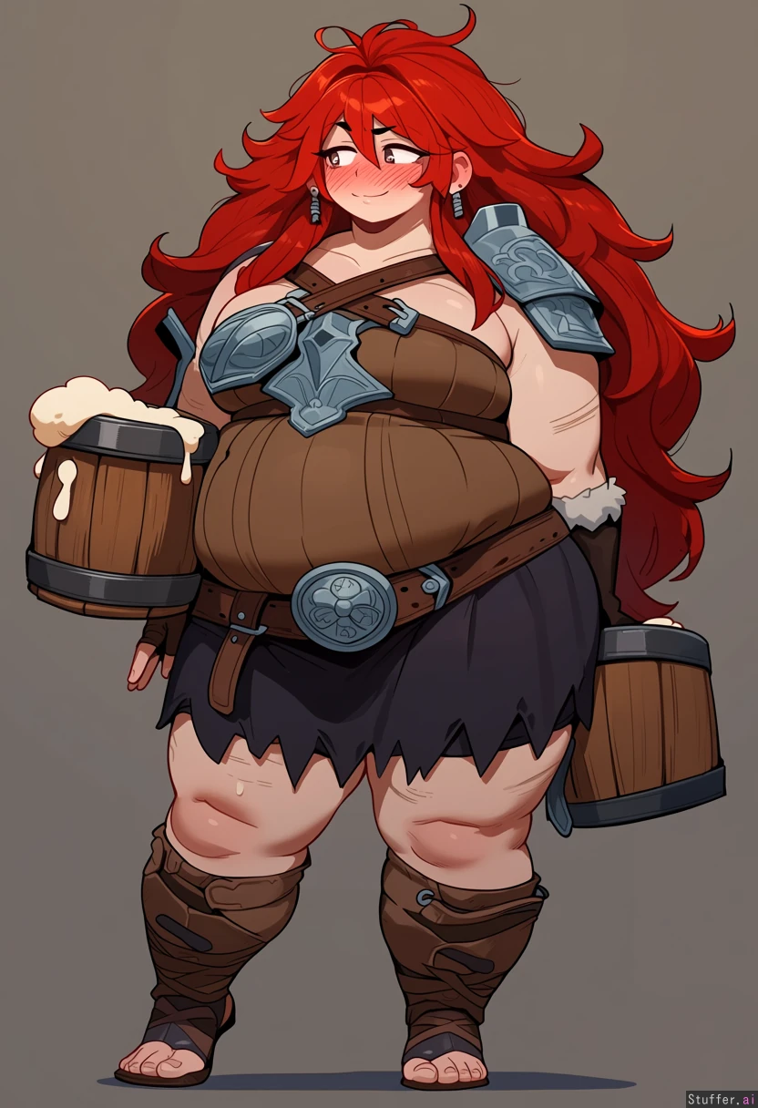 shy barbarian woman glancing at her feet. In a tavern. very tall, long messy red hair, fingerless gloves. solid tattered kilt with large belt with round belt buckle and sporran. leather clothes and straps. armor on shoulders. multiple earrings. overweight, heavy, soft. big soft belly, gained weight, very fat. friendly. blushing. holding large stein of beer, one hand behind her back