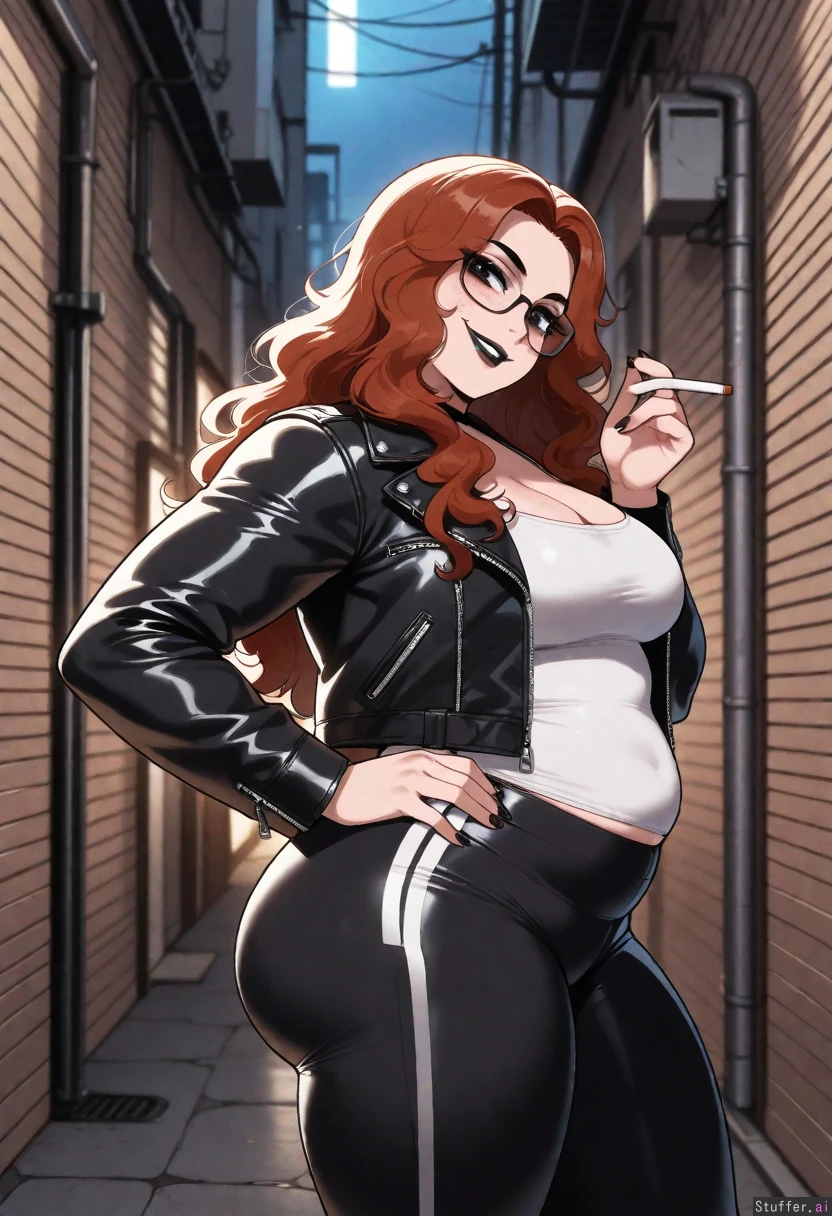 (( solo, nyantcha)) (( Goth, long_hair, wavy _hair,hair_over_shoulder, freckles, glasses, black_lipstick, black_eyeshadow)) (( leather_jacket, white_tank_top, leggings)) (( Medium_breasts:1.0)) (( Chubby belly:0.9)) (( Thick_thighs:1.0)) (( moonlight, smirk, holding_cigarette, head_tilt, side_view, alley, looking_at_viewer, hand_on_hip))
