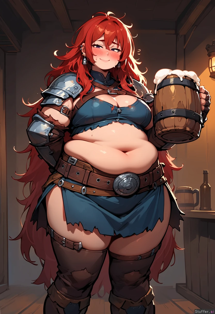 shy barbarian woman glancing at her feet. Standing in the local tavern. very tall, long messy red hair, fingerless gloves. solid tattered kilt with large belt with round belt buckle and sporran. leather clothes and straps. armor on shoulders. multiple earrings. overweight, heavy, soft. big soft belly, gained weight, very fat. friendly. blushing. holding large stein of beer, one hand behind her back