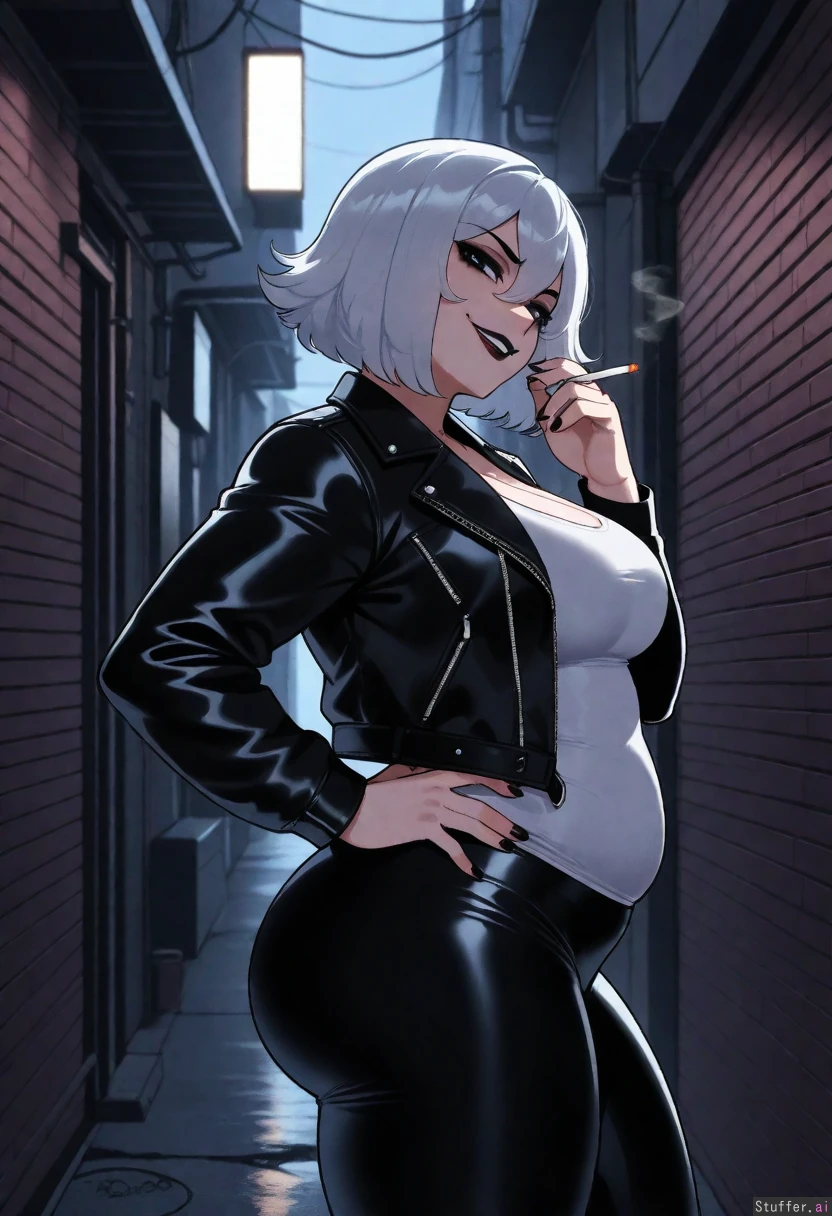 (( solo, nyantcha)) (( Zelda , black_lipstick, black_eyeshadow)) (( leather_jacket, white_tank_top, leggings)) (( Medium_breasts:1.0)) (( Chubby belly:0.9)) (( Thick_thighs:1.0)) (( moonlight, smirk, holding_cigarette, head_tilt, side_view, alley, looking_at_viewer, hand_on_hip))