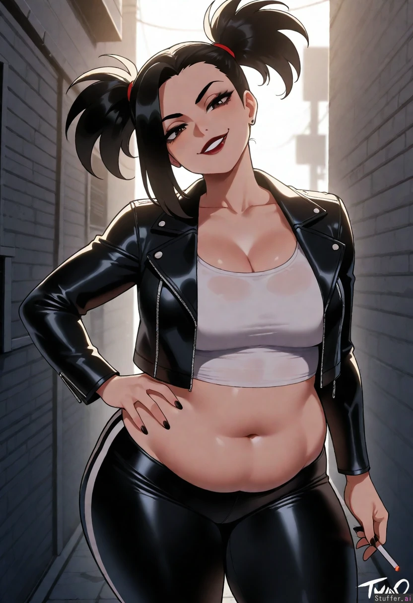 (( solo, nyantcha)) (( yaoiorozu_momo )) , black_lipstick, black_eyeshadow)) (( leather_jacket, white_tank_top, leggings)) (( Medium_breasts:1.0)) (( Chubby belly:0.9)) (( Thick_thighs:1.0)) (( moonlight, smirk, holding_cigarette, head_tilt, side_view, alley, looking_at_viewer, hand_on_hip))