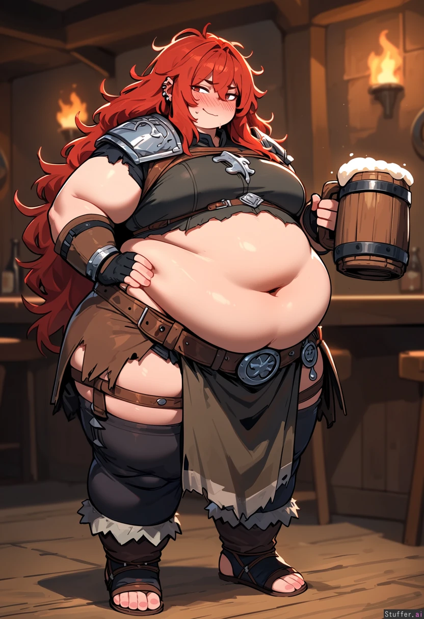 shy barbarian woman glancing at her feet. Standing in the local tavern. very tall, long messy red hair, fingerless gloves. solid tattered kilt with large belt with round belt buckle and sporran. leather clothes and straps. armor on shoulders. multiple earrings. overweight, heavyset, soft. (big soft belly:1.4), gained weight, very fat. friendly. blushing. holding large stein of beer