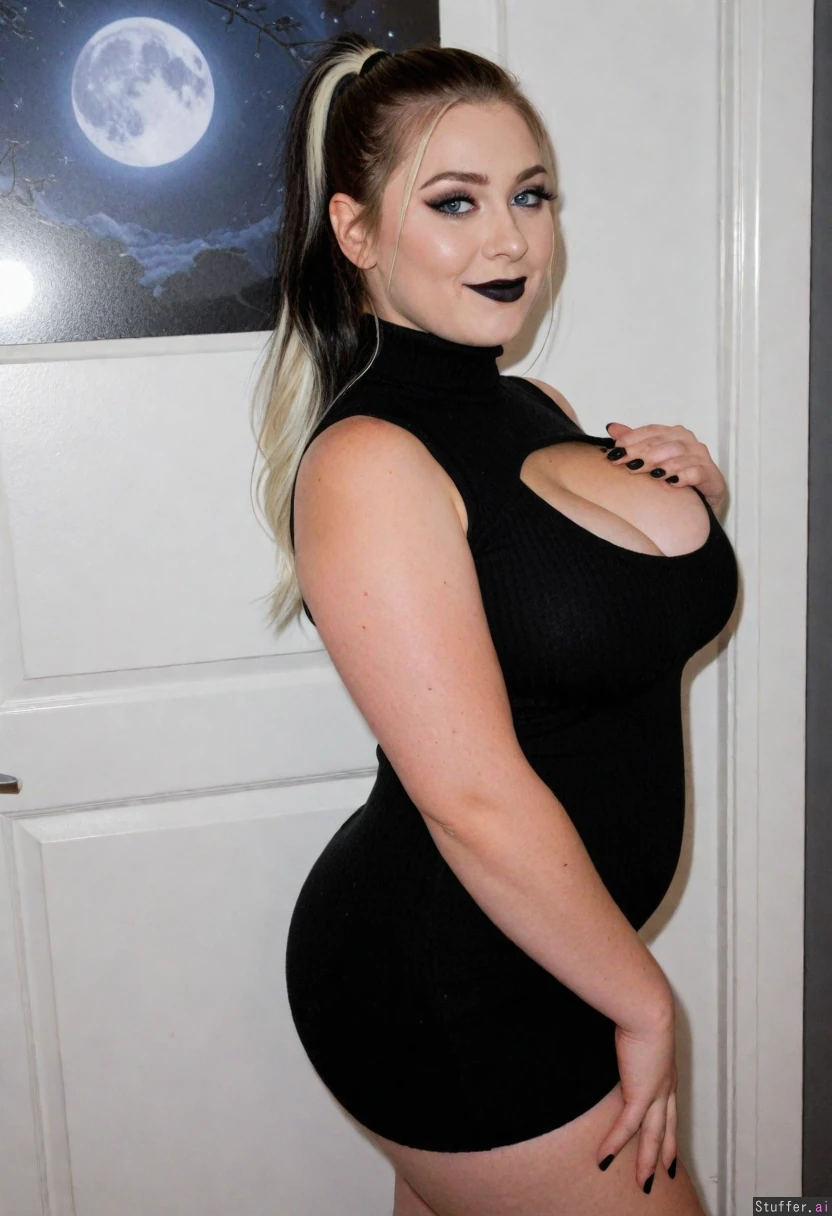 (( solo, nyantcha)) (( black_hair, long_hair, white_highlights, blue_eyes, high_ponytail, plump_lips, mole_under_eye, black_eyeshadow, black_lipstick )) (( turtleneck_dress, sleeveless_dress, cleavage, side_ponytail, black_dress, black_nails)) (( Medium_breasts:1.0)) (( Chubby belly:0.9)) (( Thick_thighs:1.0)) (( Doorway, ((moonlight)), half-closed_eyes, smiling, leaning_forward, hands_on_chest))